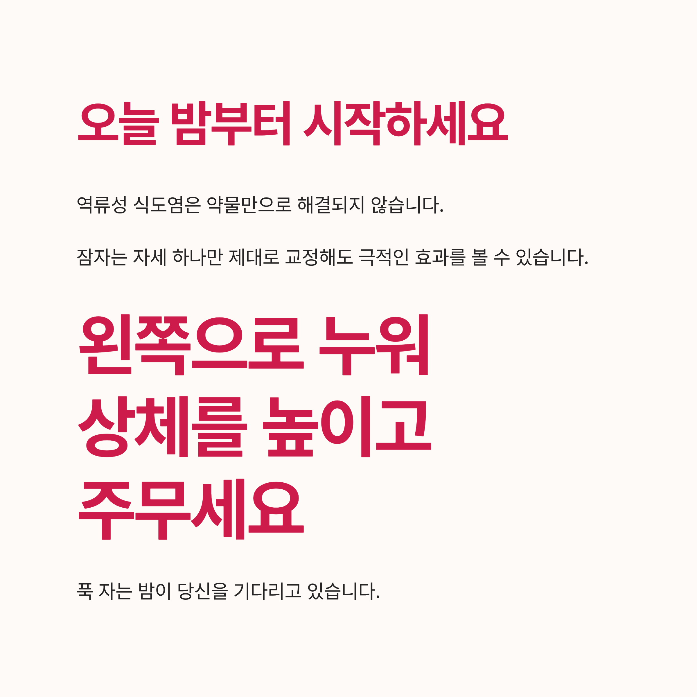 실제로 많은 환자들이 이 자세로 바꾼 후 야간 가슴 쓰림, 트림, 속쓰림 증상이 확연히 줄어들었다고 보고하고 있습니다.