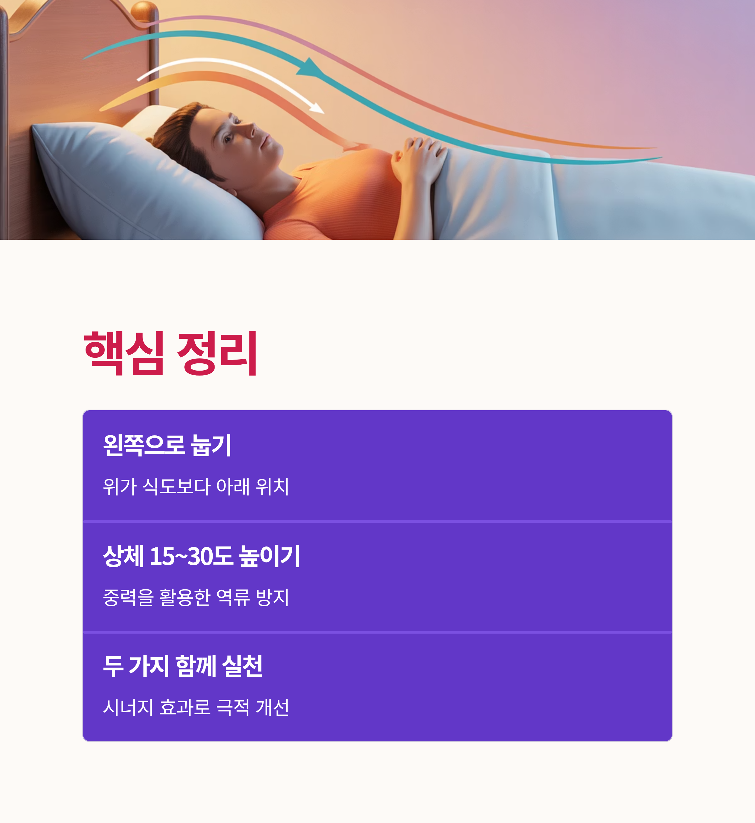 왼쪽으로 눕는 자세와 상체를 세우는 경사 자세를 동시에 적용하면 각각의 효과가 시너지로 작용합니다. 이 두 가지를 함께 실천하면 위산 역류를 최소화하면서도 편안한 수면을 취할 수 있습니다.