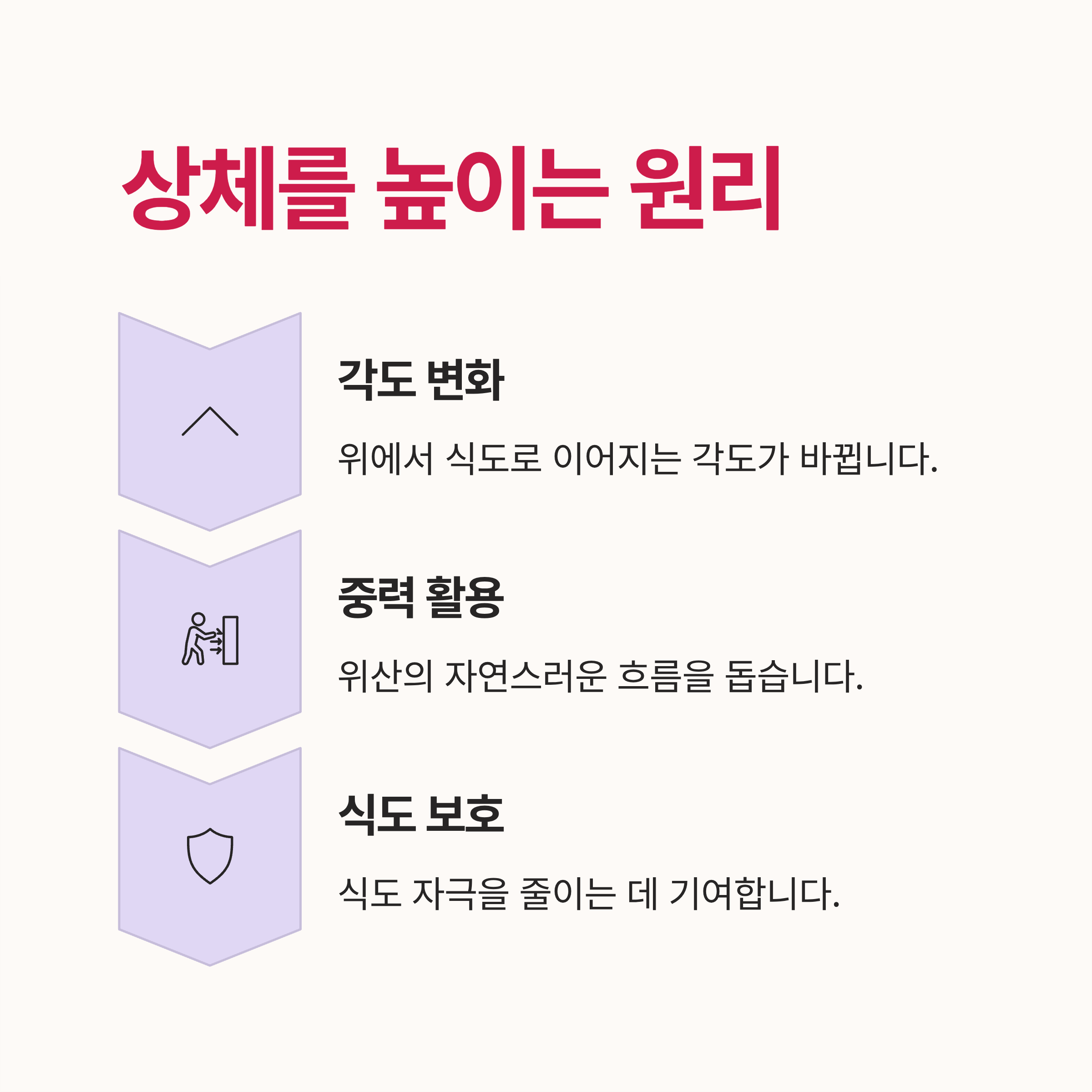 상체를 약 20도 정도 세우면 위에서 식도로 이어지는 각도가 바뀌고, 중력의 방향을 이용해 위산의 자연스러운 흐름을 돕고 식도 자극을 줄이는 데 기여합니다.