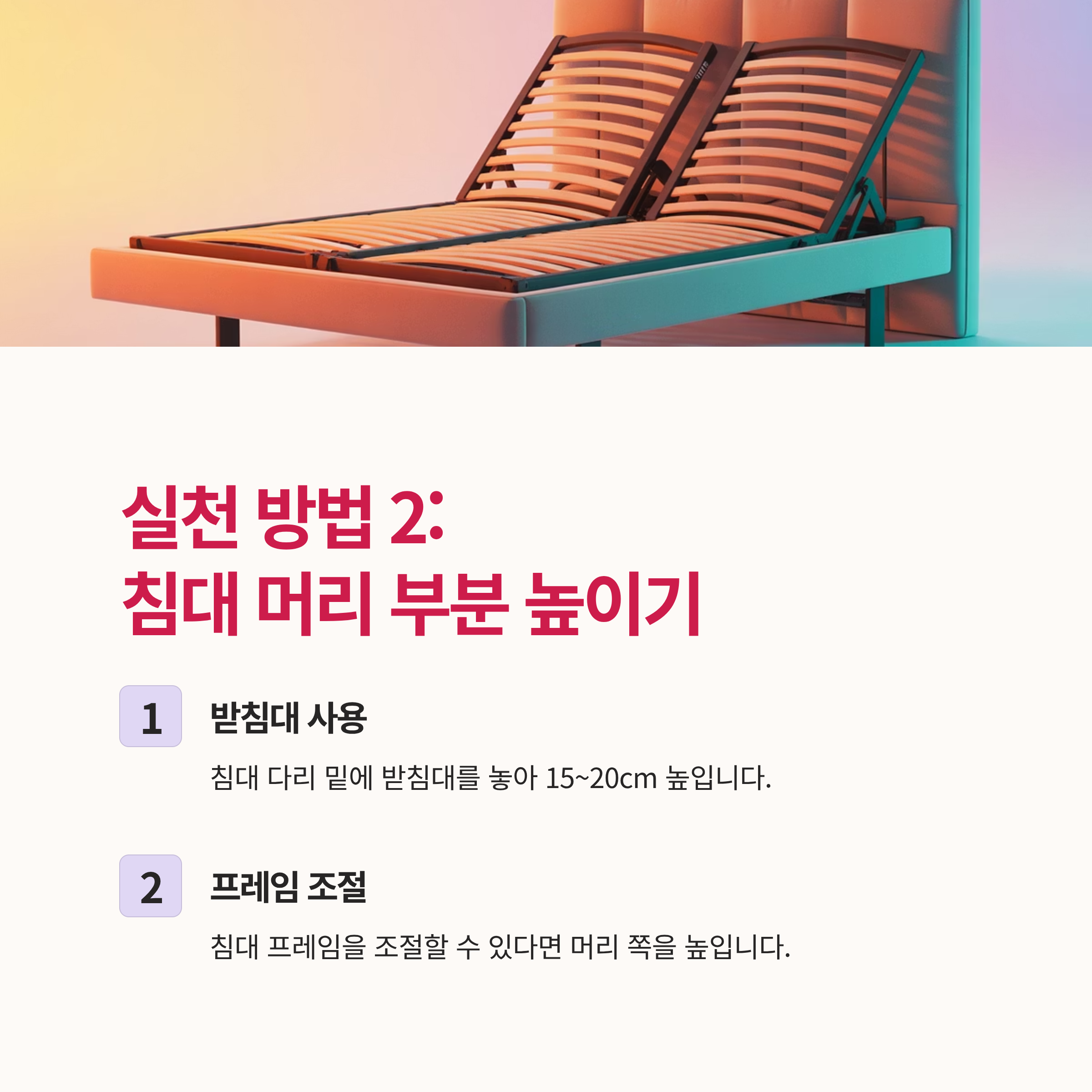 침대 다리 밑에 받침대를 놓거나 침대 프레임을 조절할 수 있다면 머리 쪽을 15~20cm 정도 높이는 것도 좋은 방법입니다.