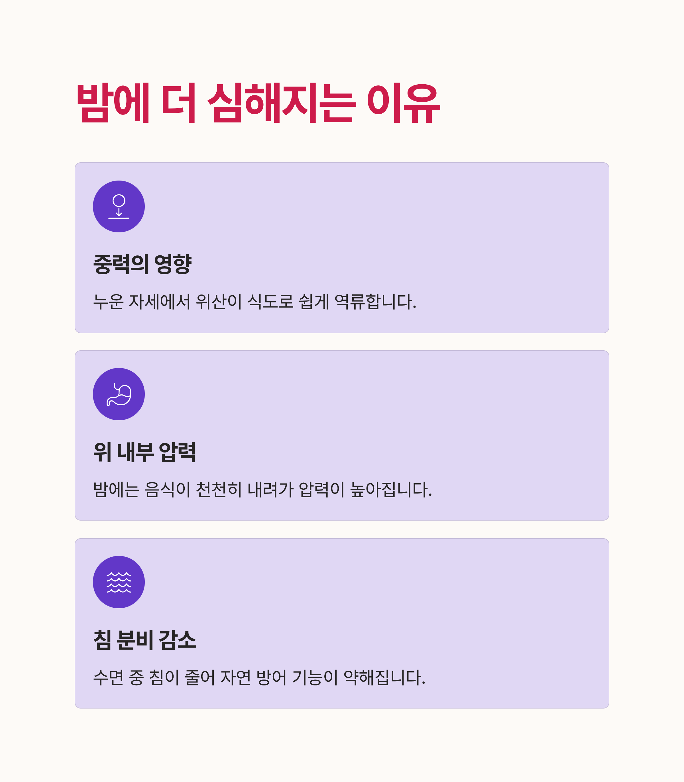 역류성 식도염은 유독 밤에 증상이 악화됩니다. 낮에는 서 있거나 앉아 있어 중력의 영향으로 위산이 아래로 내려가지만, 수면 중 누운 자세에서는 위산이 식도로 쉽게 역류할 수 있습니다.