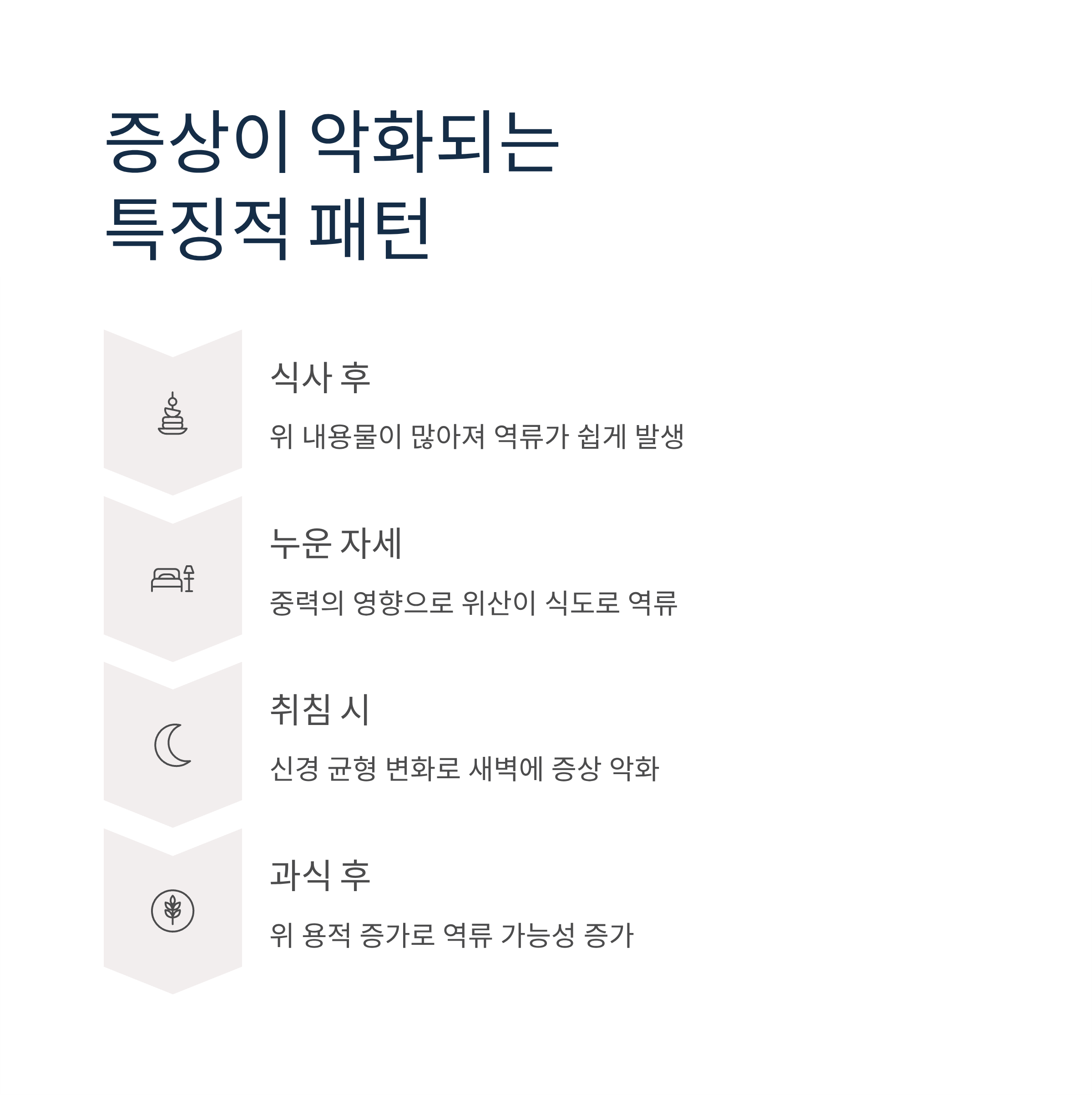 - 식사 후: 위 내용물이 많아져 역류가 쉽게 발생