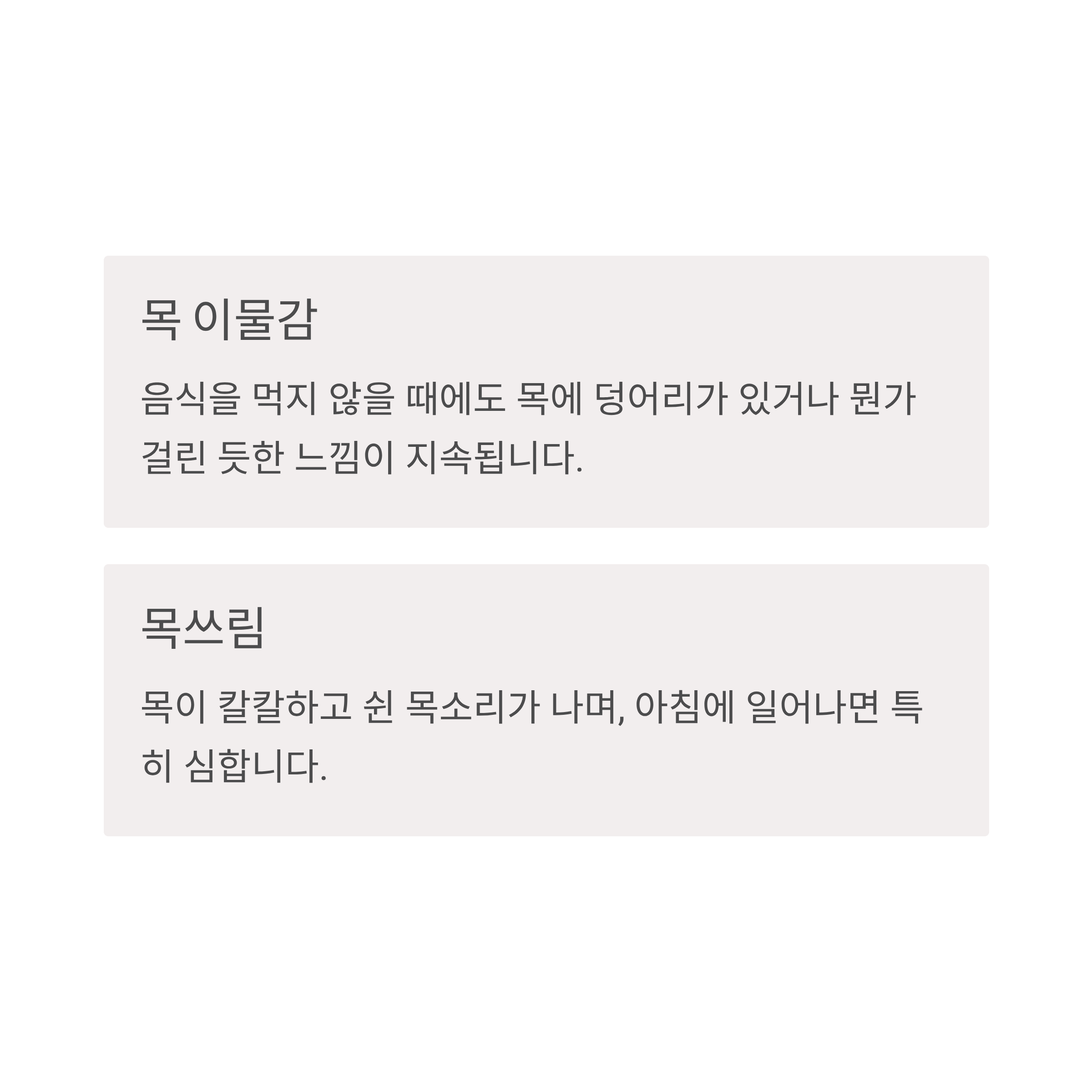 목이 칼칼하고 쉰 목소리가 나며, 아침에 일어나면 특히 심합니다. 밤새 위산이 역류했기 때문입니다.
