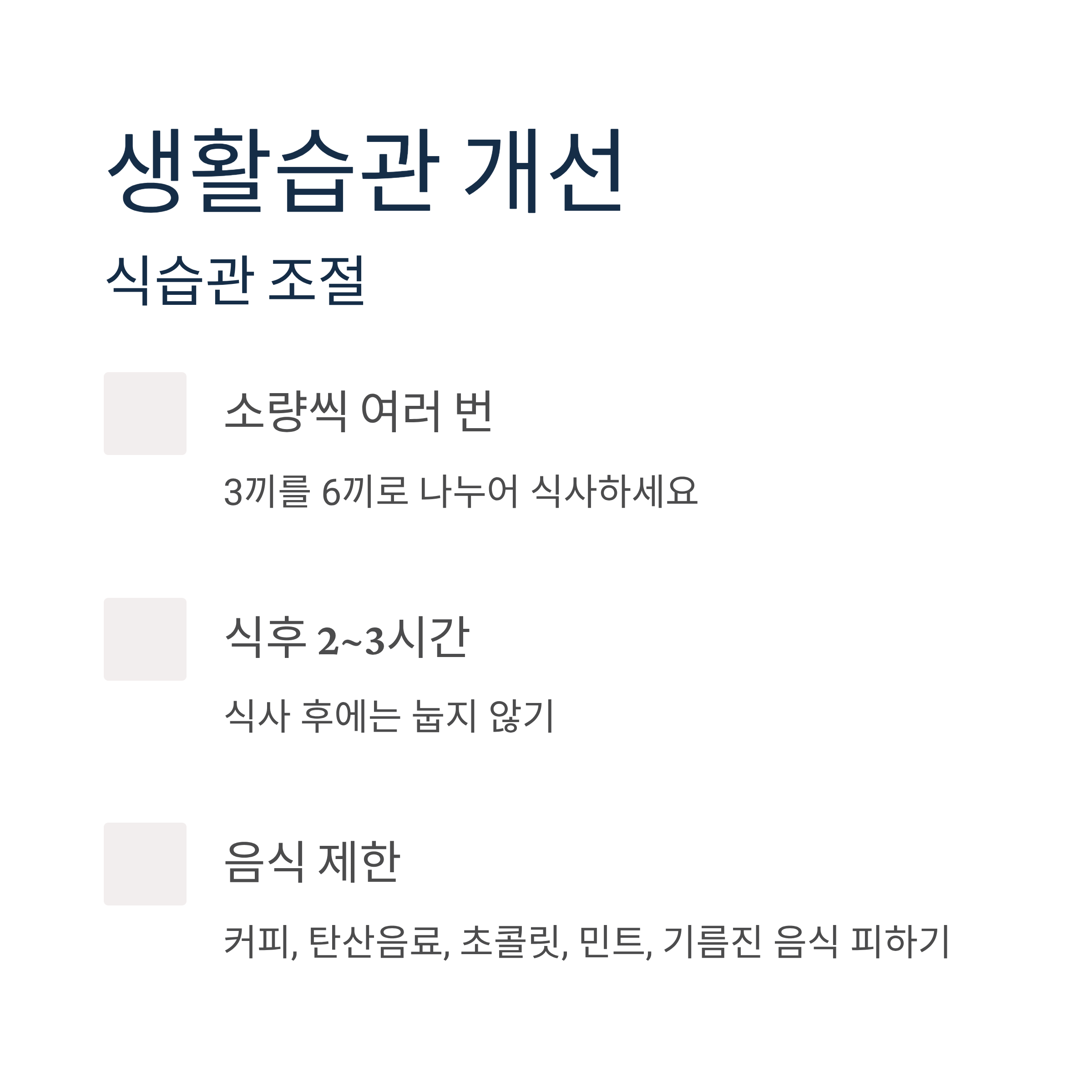 - 커피, 탄산음료, 초콜릿, 민트, 기름진 음식 제한