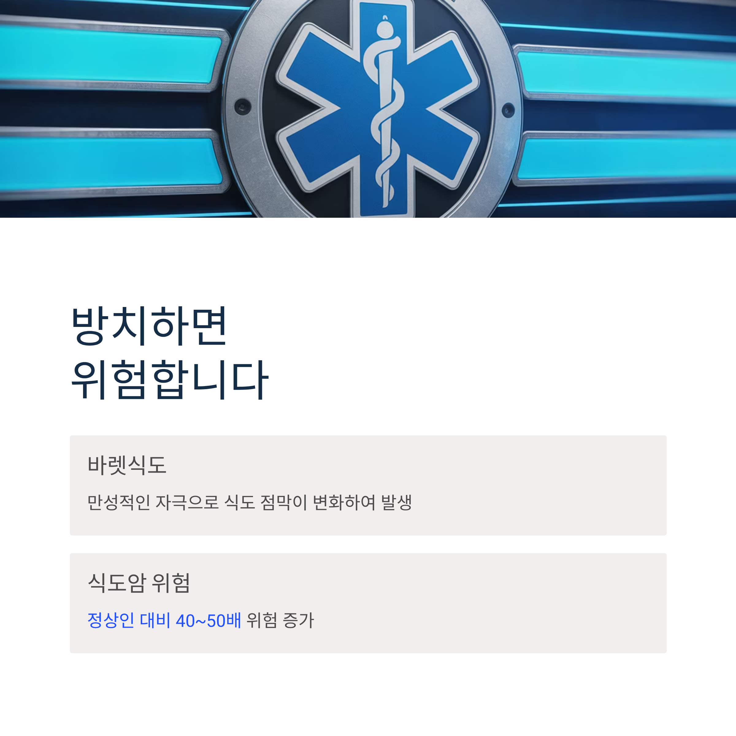 역류성 식도염을 오래 방치하면 식도 점막이 만성적인 자극으로 바렛식도가 생길 수 있습니다. 바렛식도에서는 선암이라는 드문 형태의 식도암이 발생할 수 있는데, 정상인에 비해 위험이 40~50배 증가합니다.