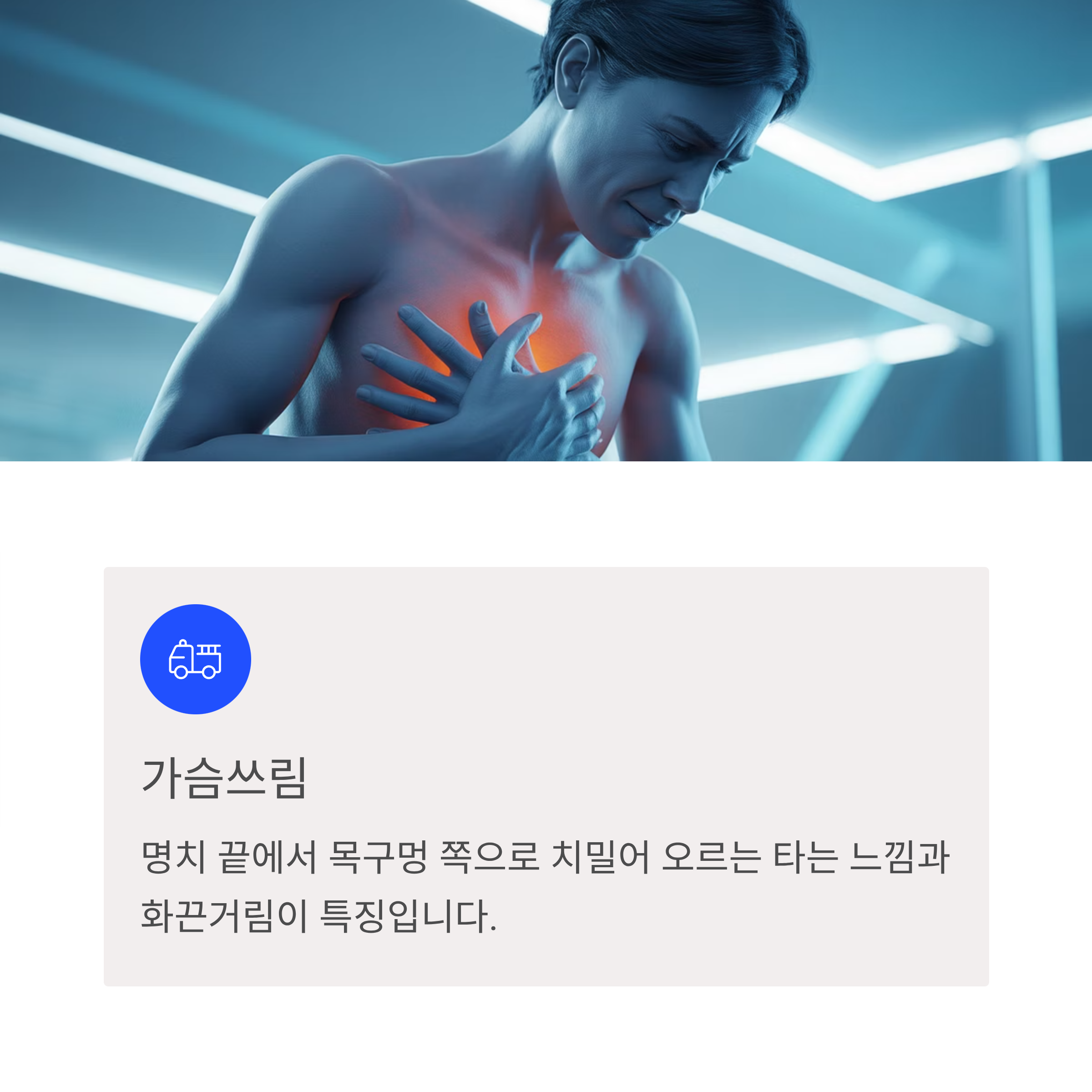 명치 끝에서 목구멍 쪽으로 치밀어 오르는 듯한 타는 느낌, 화끈거림, 쓰린 느낌이 특징적입니다. 이 증상은 등이나 목 쪽으로 뻗칠 수 있습니다.