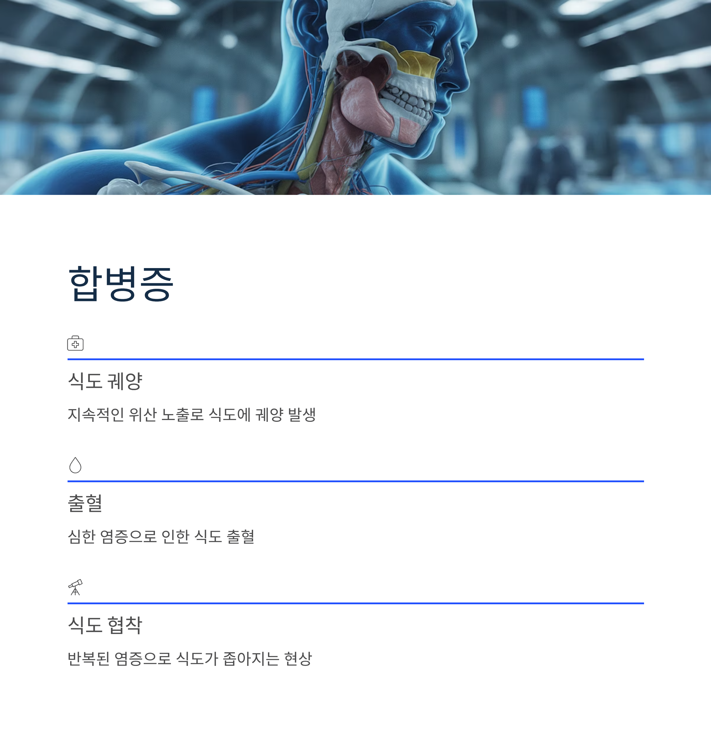 또한 식도 궤양, 출혈, 식도 협착 등의 합병증이 발생할 수 있습니다.