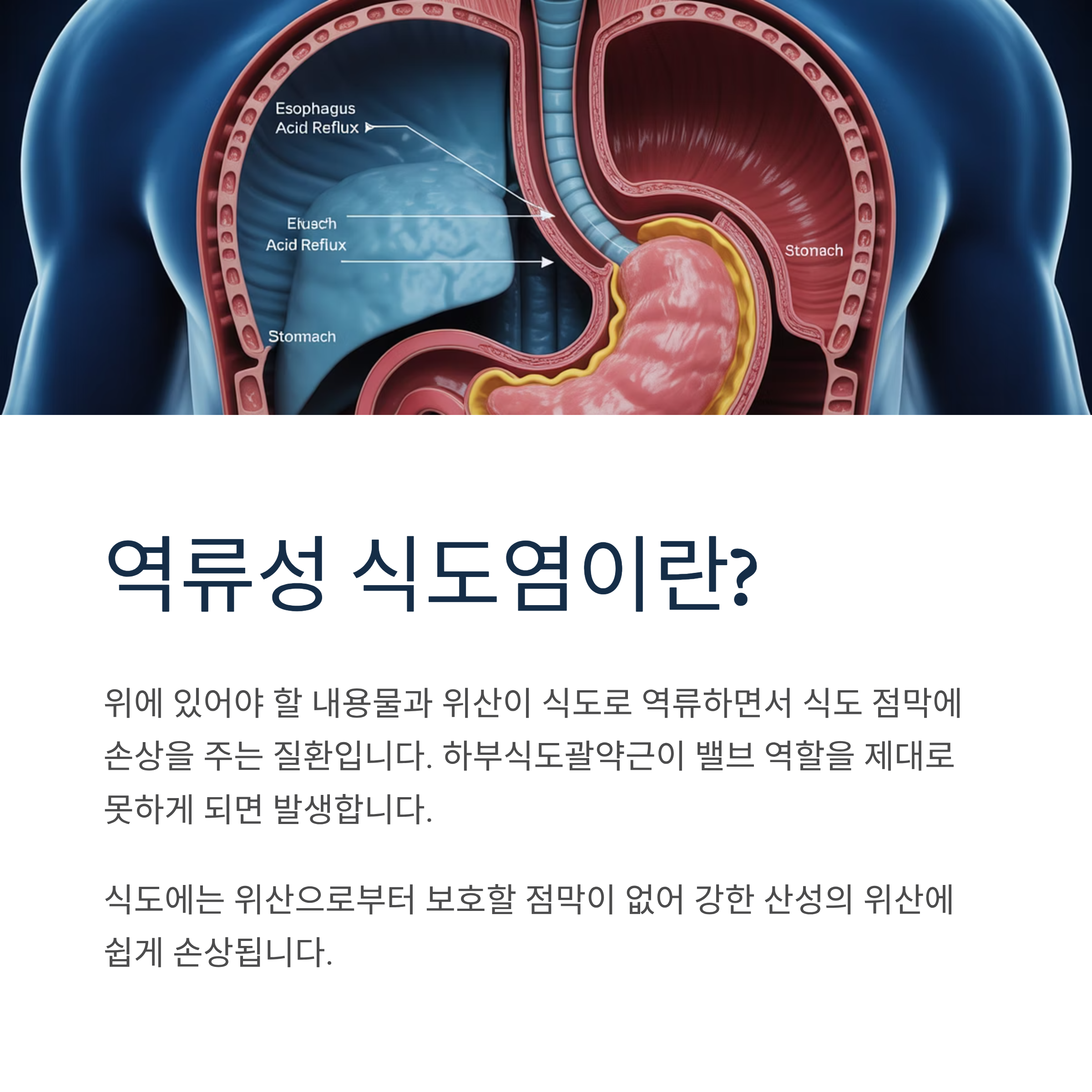역류성 식도염은 위에 있어야 할 내용물과 위산이 식도로 역류하면서 식도 점막에 손상을 주는 질환입니다. 식도와 위 사이에 있는 하부식도괄약근이 이상을 일으켜 밸브 역할을 제대로 못하게 되면 발생합니다.