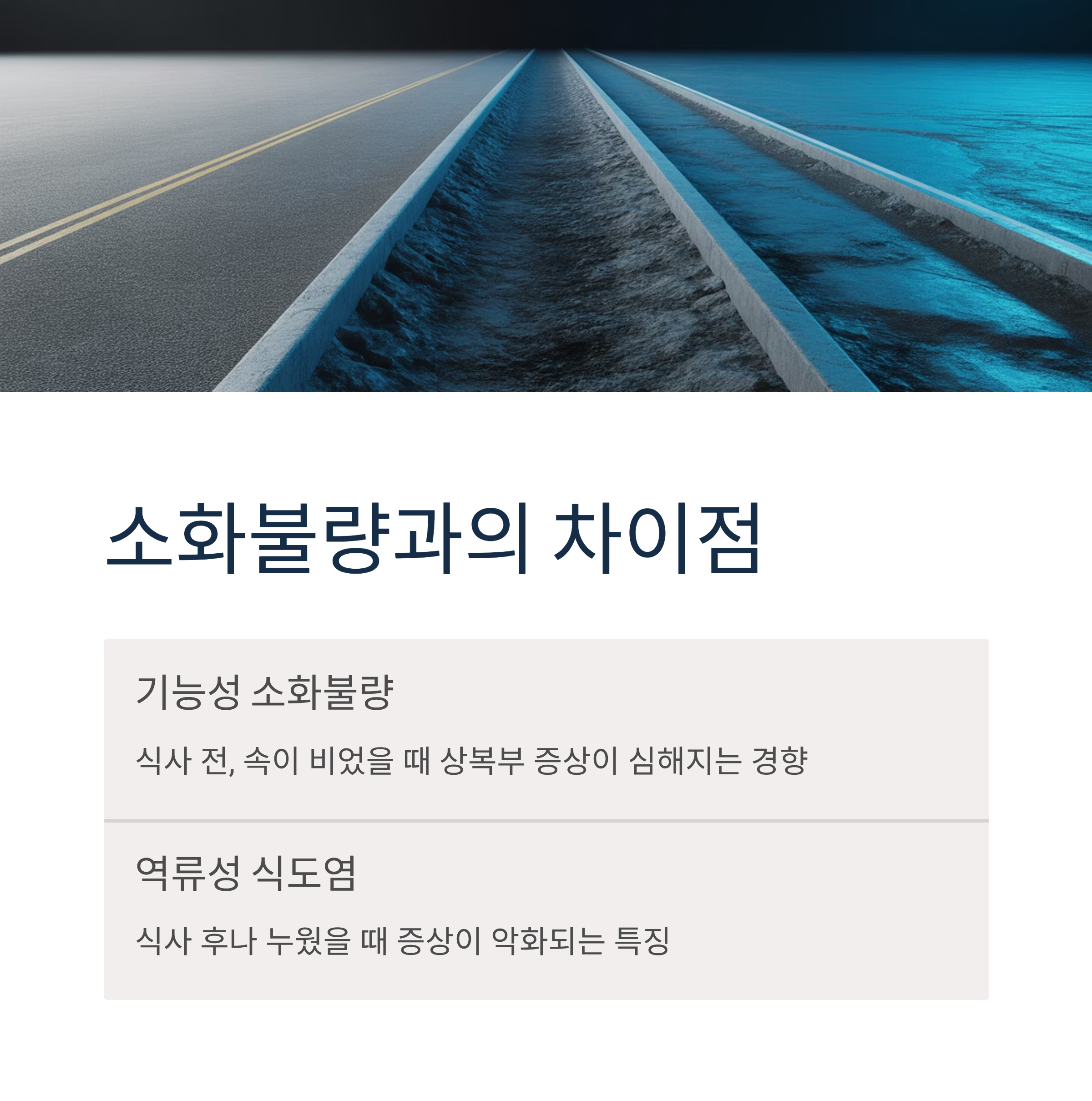 반면 역류성 식도염은 식사 후나 누웠을 때 증상이 악화되므로 발생 시간에 차이가 있습니다.