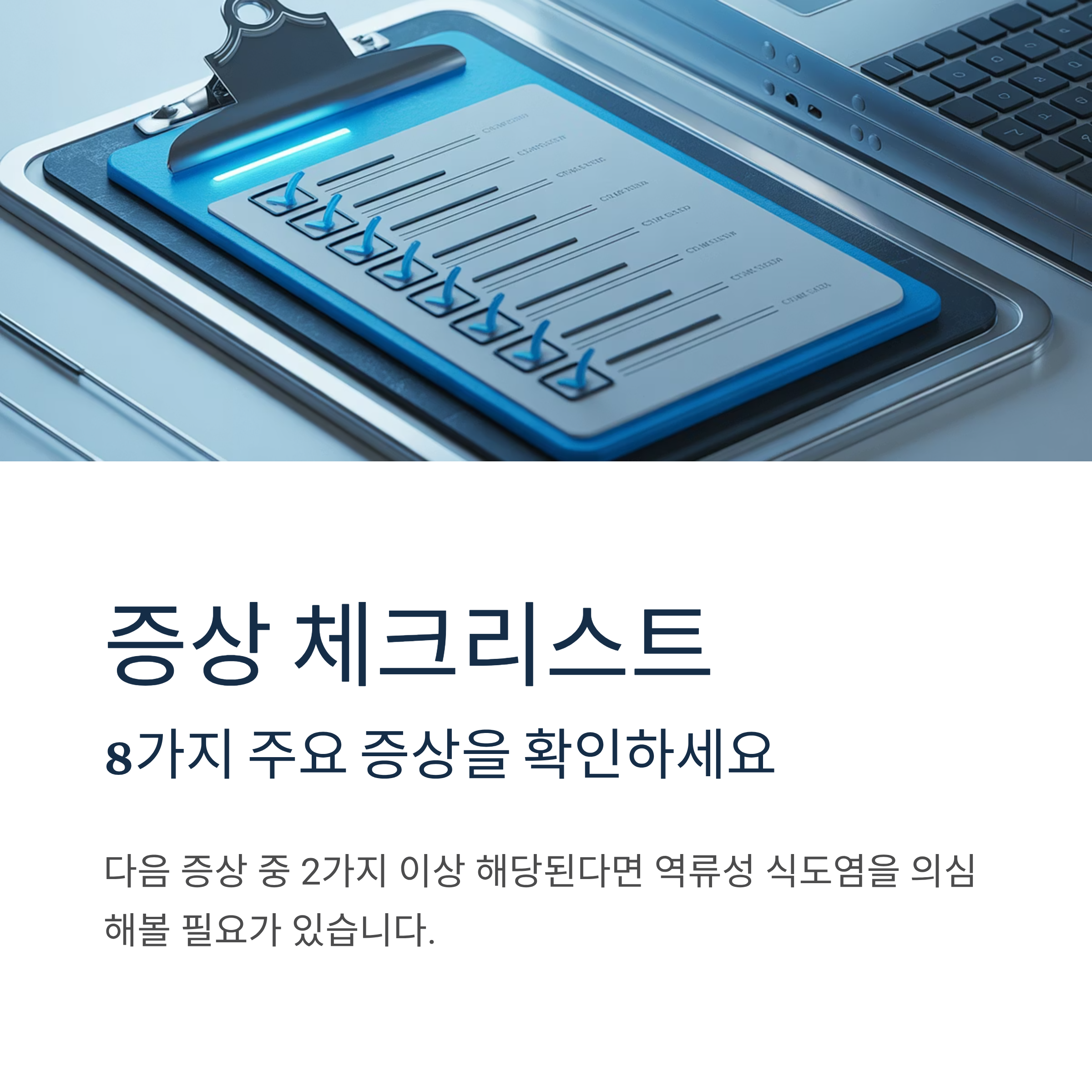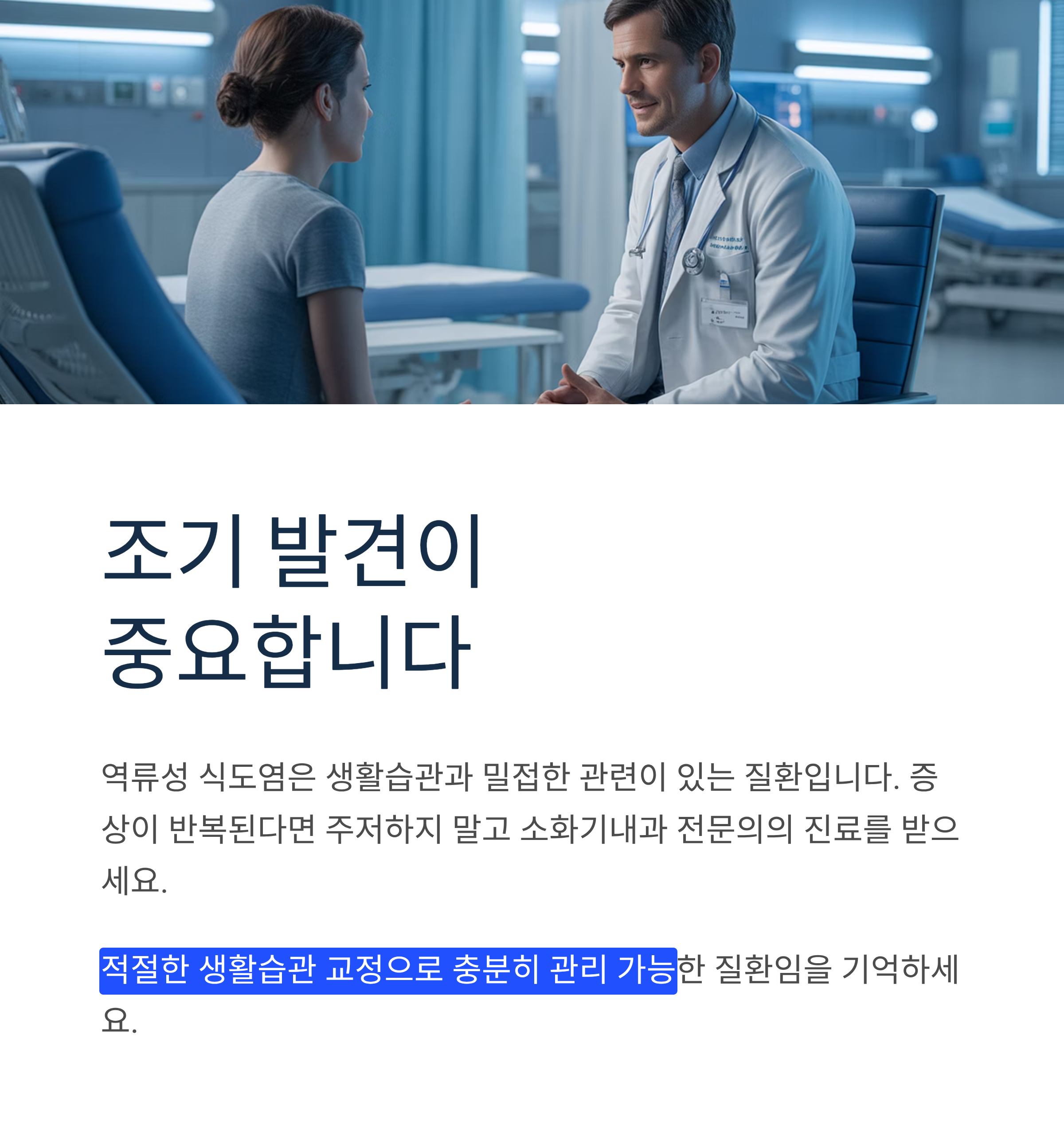 역류성 식도염은 생활습관과 밀접한 관련이 있는 질환입니다. 위에서 언급한 증상이 반복된다면 주저하지 말고 소화기내과 전문의의 진료를 받아 정확한 진단과 치료를 받으시기 바랍니다. 조기 발견과 적절한 생활습관 교정으로 충분히 관리 가능한 질환임을 기억하세요.
