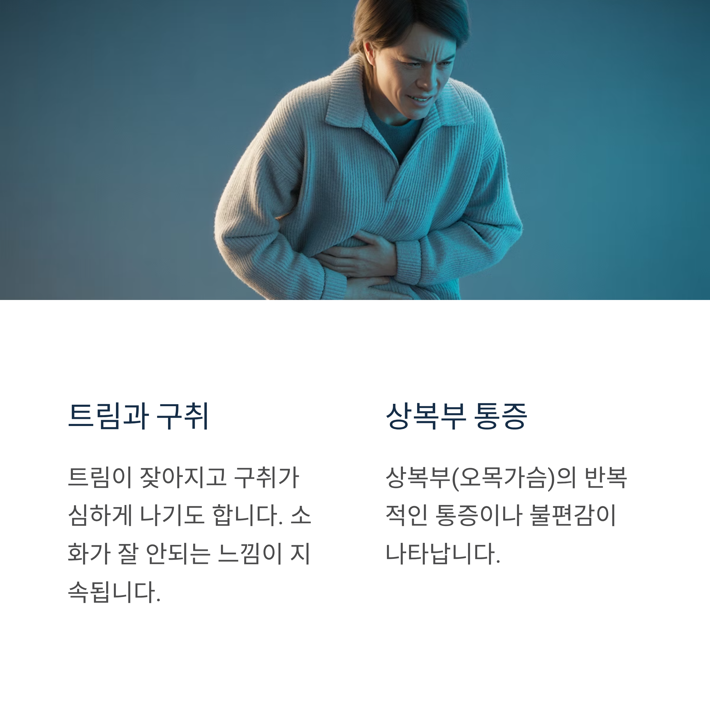 트림이 잦아지고 구취가 심하게 나기도 합니다. 소화가 잘 안되는 느낌이 지속됩니다.