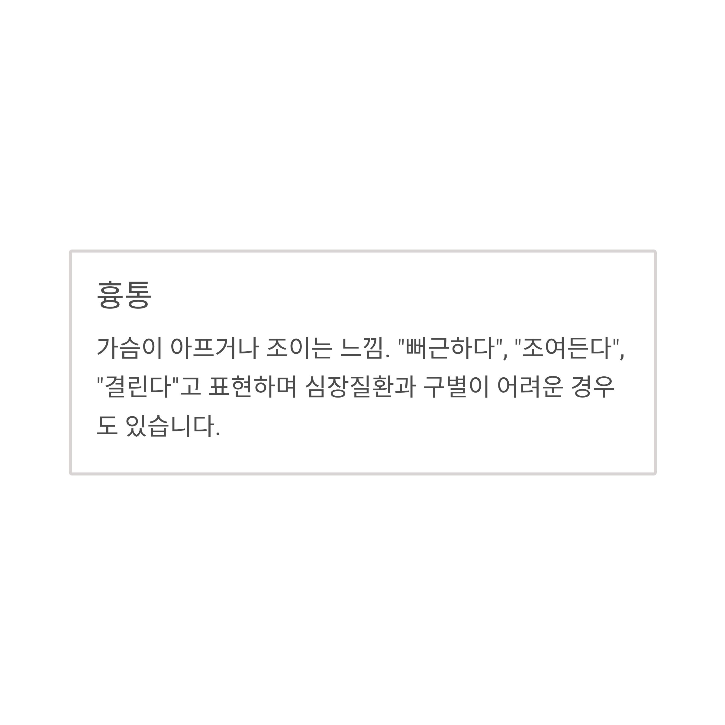 때로는 가슴이 아프거나 조이는 느낌이 발생합니다. "뻐근하다", "조여든다", "결린다", "가슴이 찢어진다"고 표현하며, 관상동맥 질환에 의한 흉통과 구별이 어려운 경우도 있습니다.
