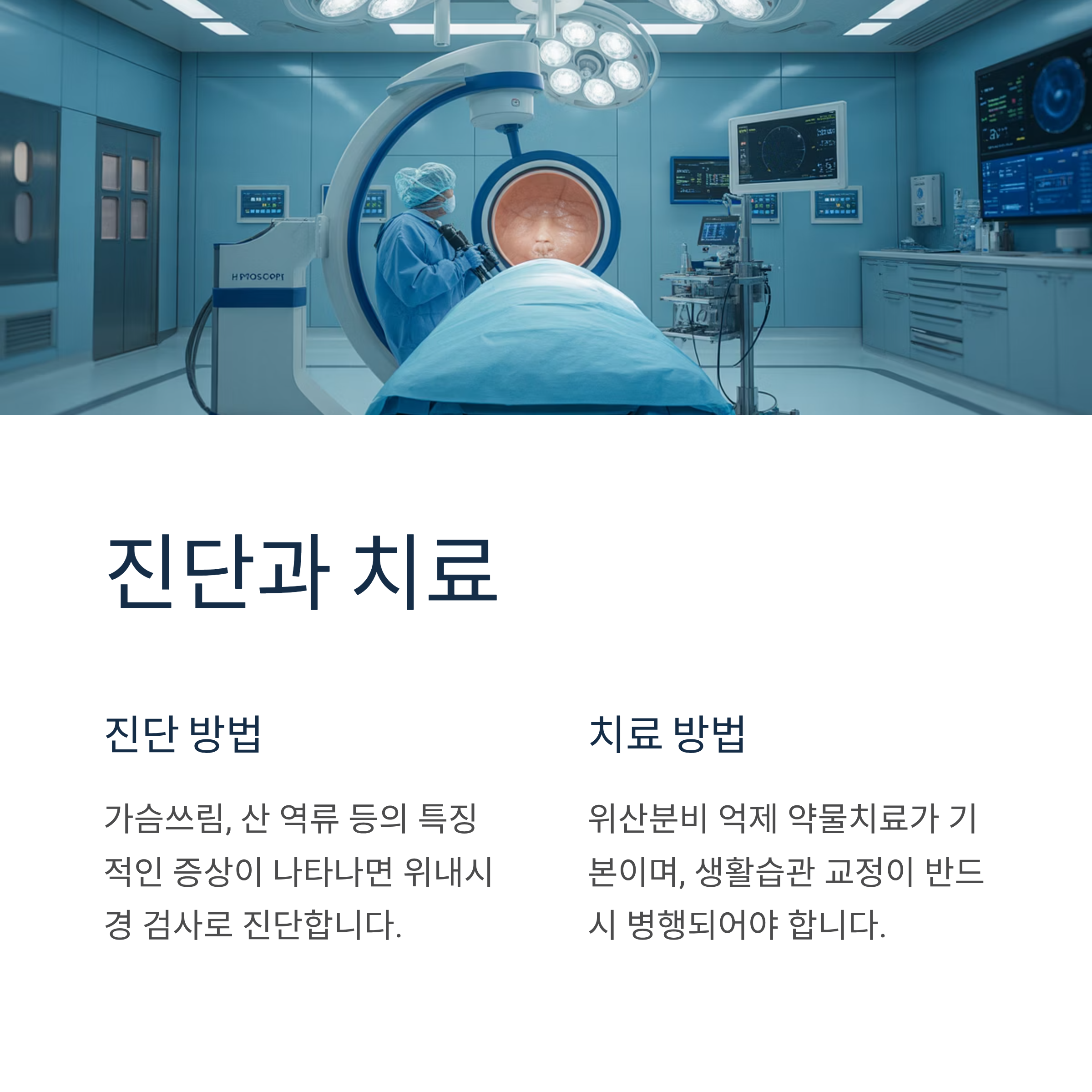치료는 위산분비를 억제하는 약물치료가 기본이며, 생활습관 교정이 반드시 병행되어야 합니다.