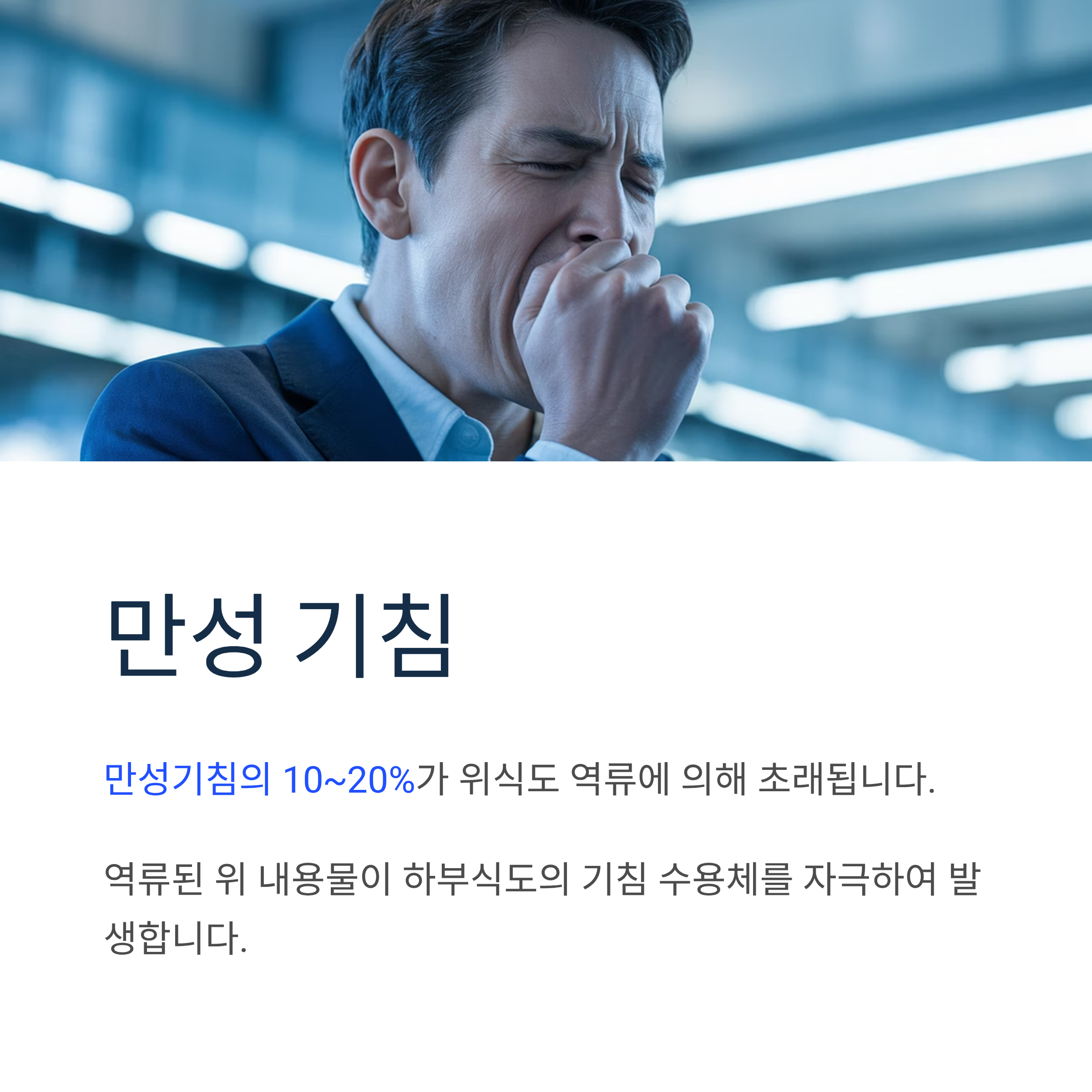 만성기침의 10~20%가 위식도 역류에 의해 초래됩니다. 역류된 위 내용물이 하부식도의 기침 수용체를 자극하여 발생합니다.