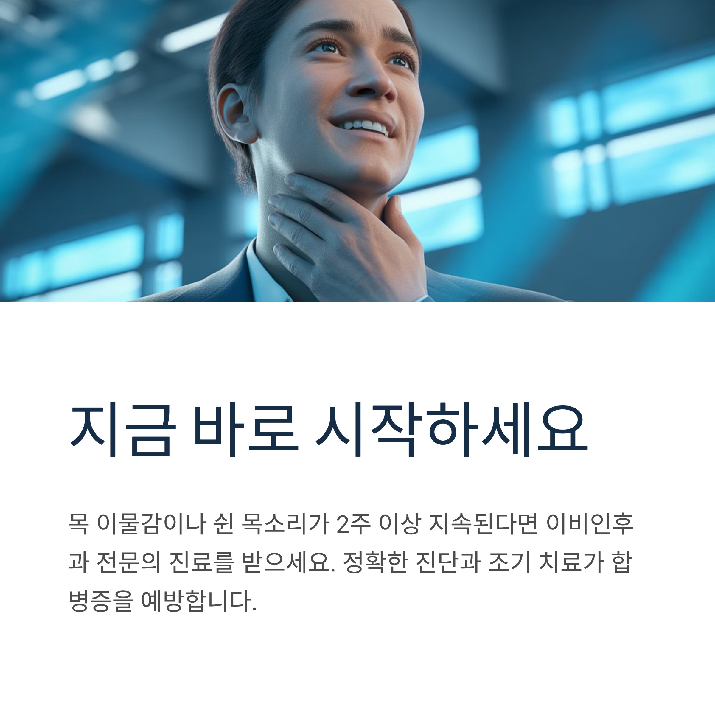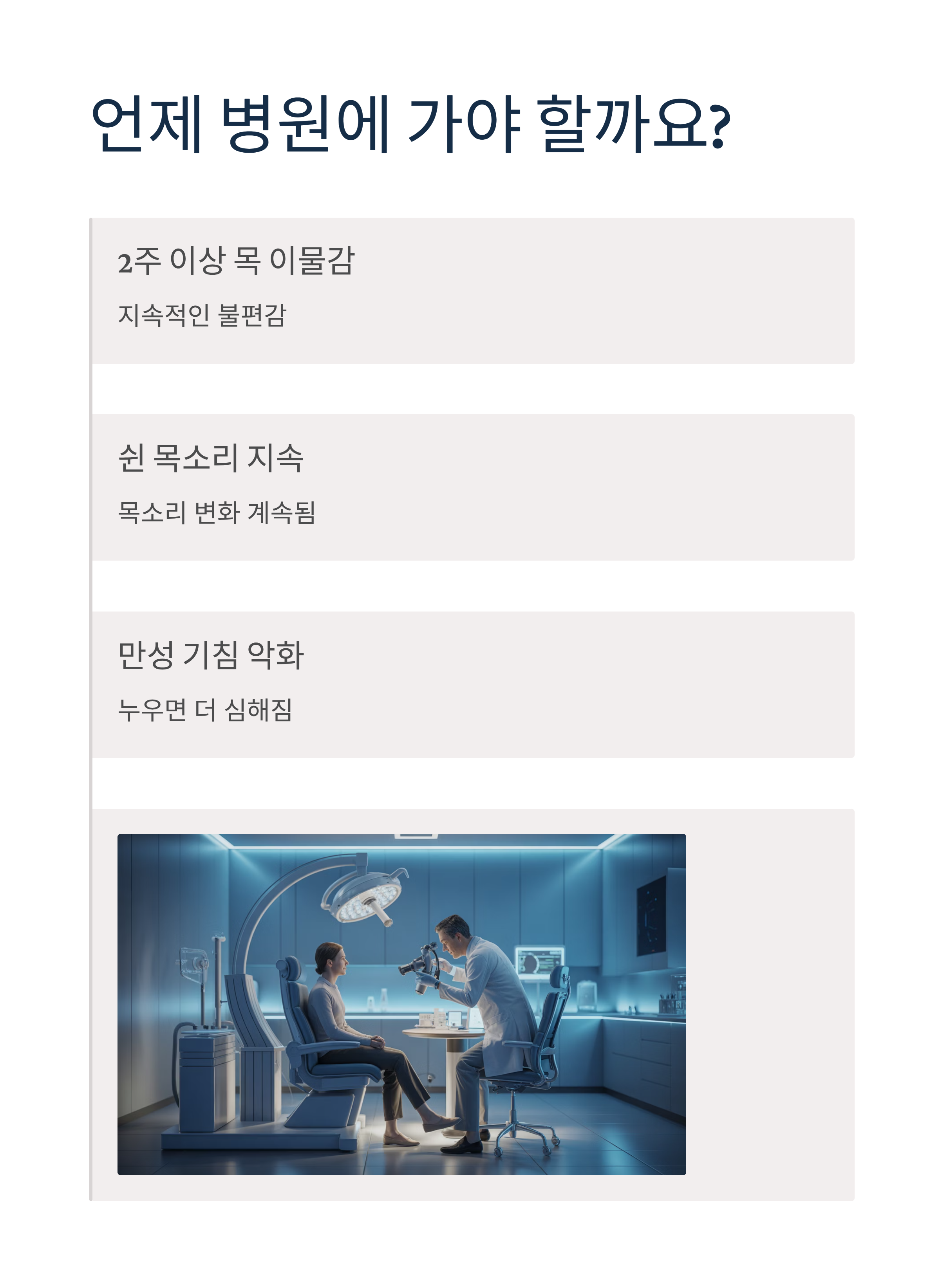 목 이물감이나 쉰 목소리가 2주 이상 지속된다면 이비인후과 전문의 진료를 받아 정확한 진단과 치료를 시작하시기 바랍니다. 조기 발견과 적절한 치료로 건강한 목 건강을 되찾으시길 바랍니다.