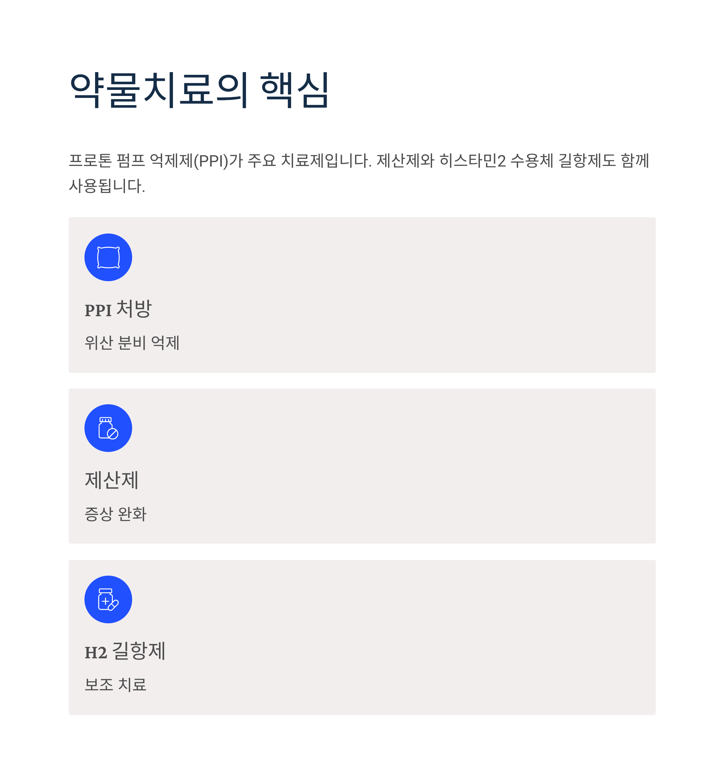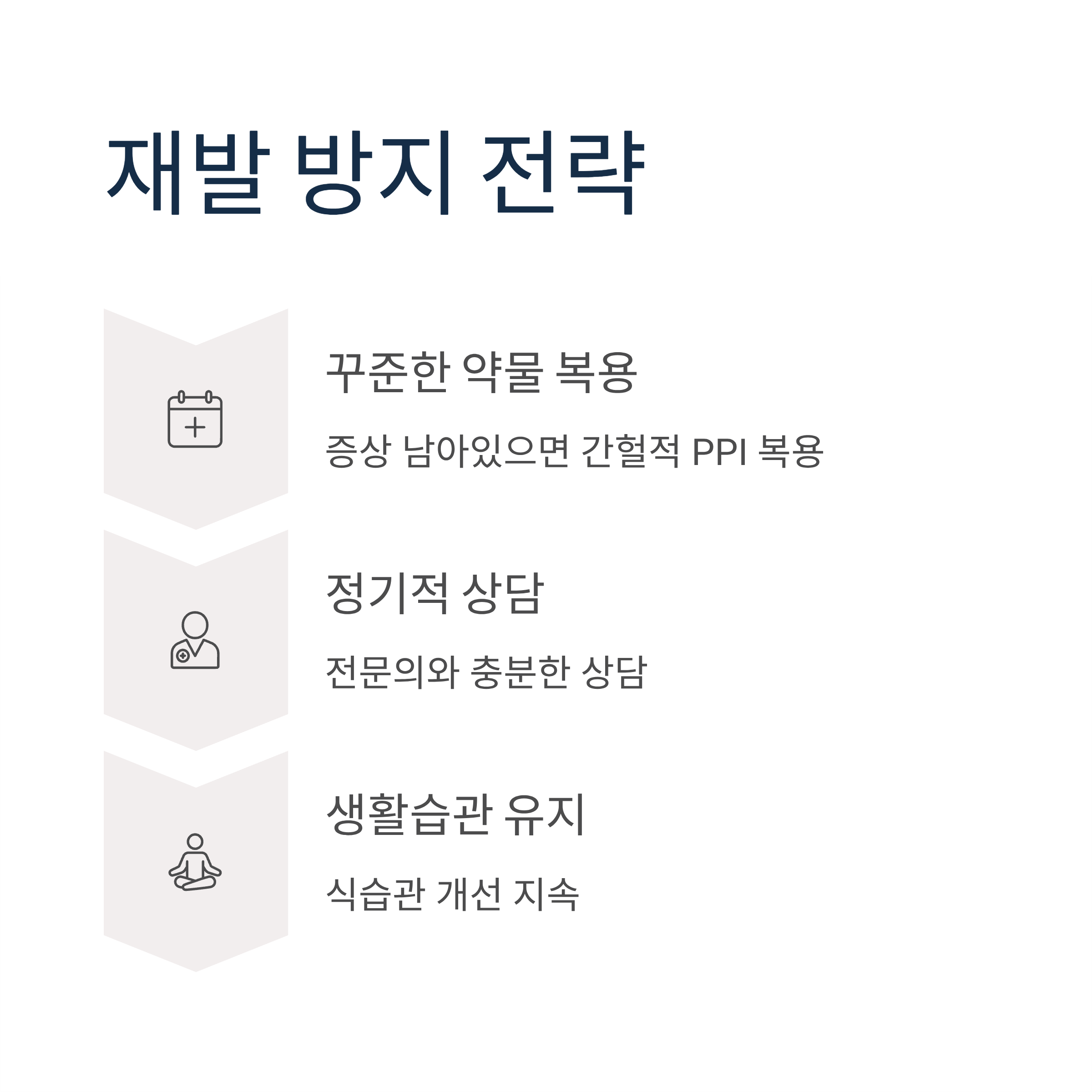 약물치료로 증상이 호전됐어도 치료 중단에 따른 재발률이 1년 내 절반을 웃도는 비율로 높게 보고됩니다. 증상이 남아있다면 간헐적인 PPI 복용을 권장하며, 환자와의 충분한 상담을 통해 필요할 경우 꾸준히 약물치료를 받는 것이 바람직합니다.