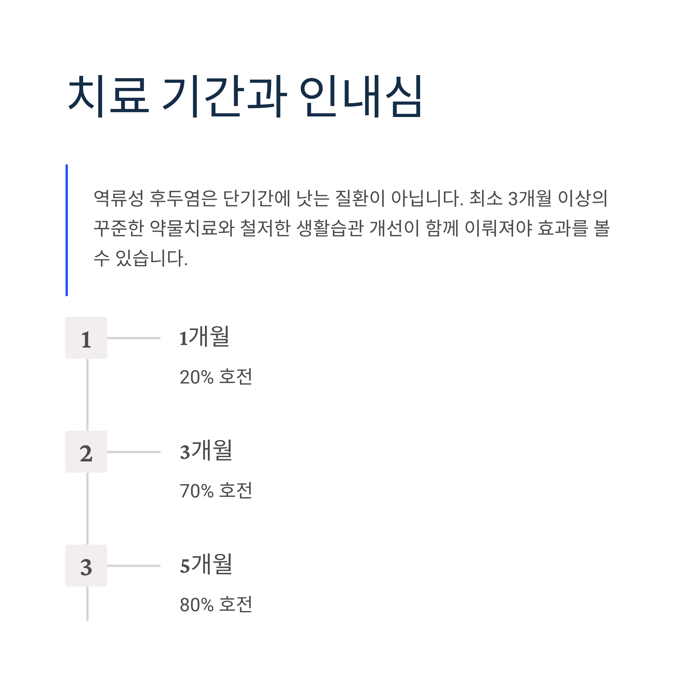 역류성 후두염은 단기간에 낫는 질환이 아닙니다. 최소 3개월 이상의 꾸준한 약물치료와 철저한 생활습관 개선이 함께 이뤄져야 효과를 볼 수 있습니다.