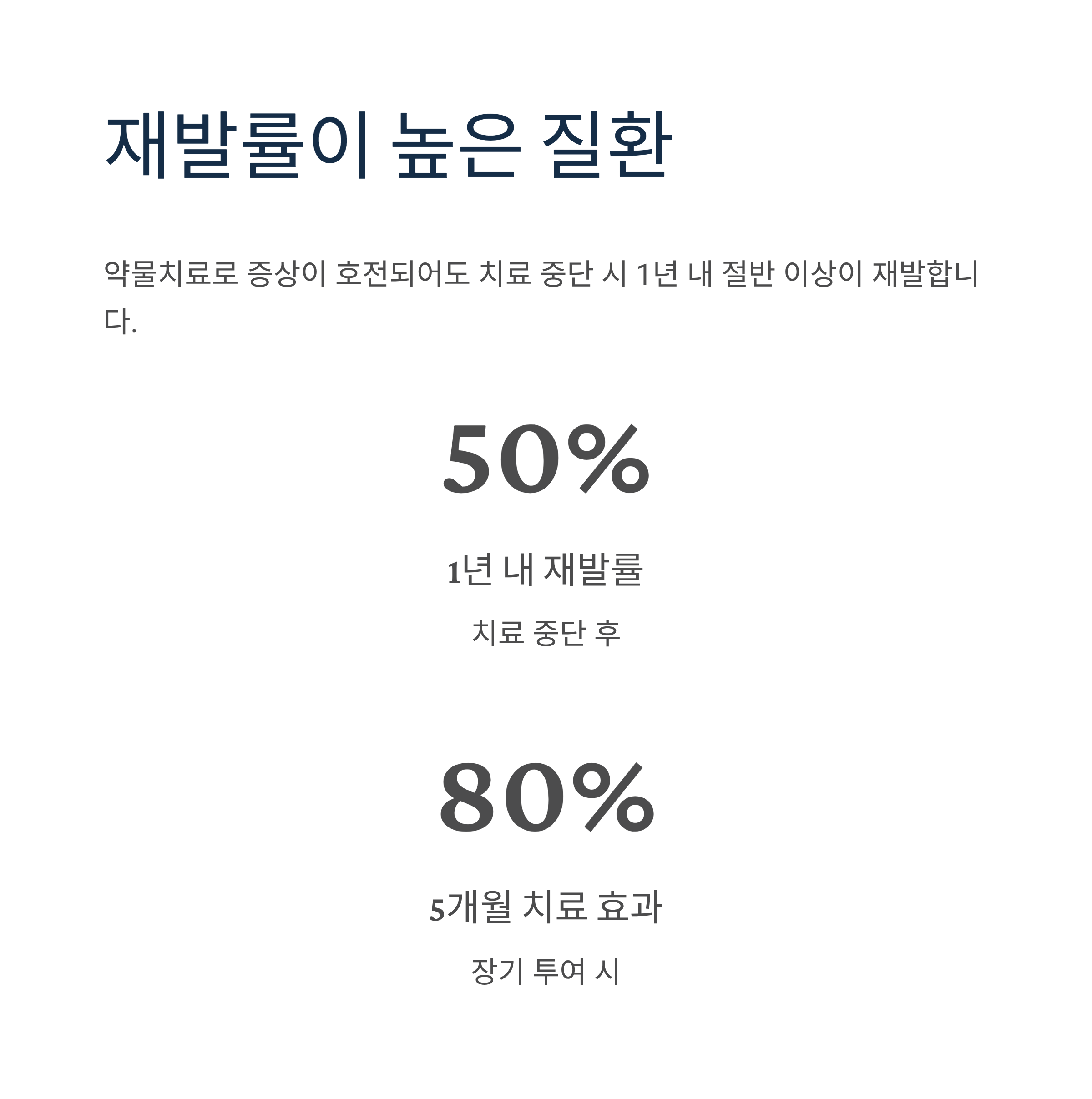 약물치료 시 1개월 내 호전되는 경우는 약 20%에 불과하며, 3개월 지난 시점에 70%, 5개월 후 80%의 환자에서 호전을 보입니다. 1~2개월의 단기 투여보다는 최소 3~4개월, 가능하면 5개월 이상의 장기 투여 시 치료 효과가 훨씬 좋습니다.