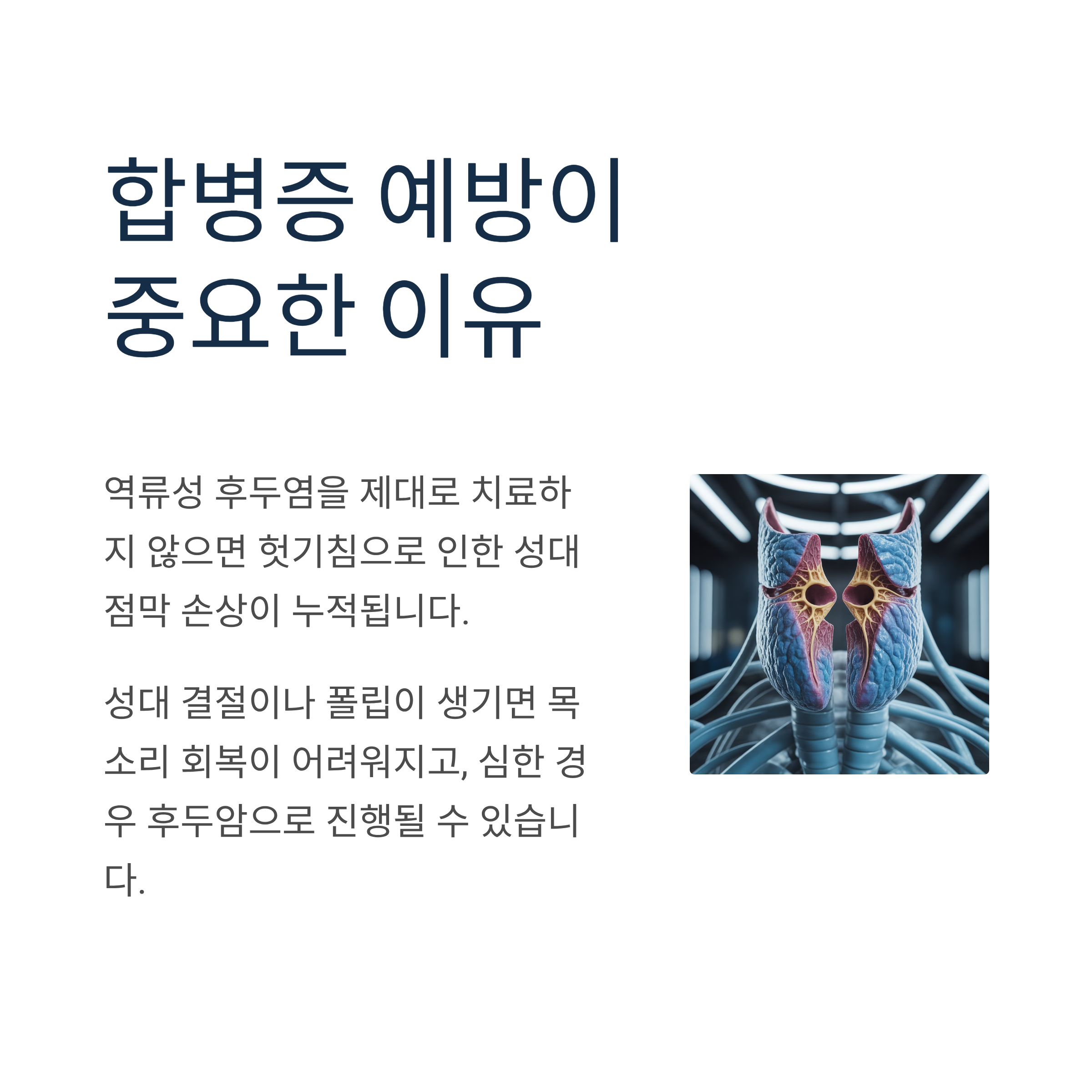 역류성 후두염을 제대로 치료하지 않고 방치하면 후두 염증이 지속되고, 헛기침으로 인한 성대 점막 손상으로 성대 결절이나 성대 폴립이 유발될 수 있습니다.