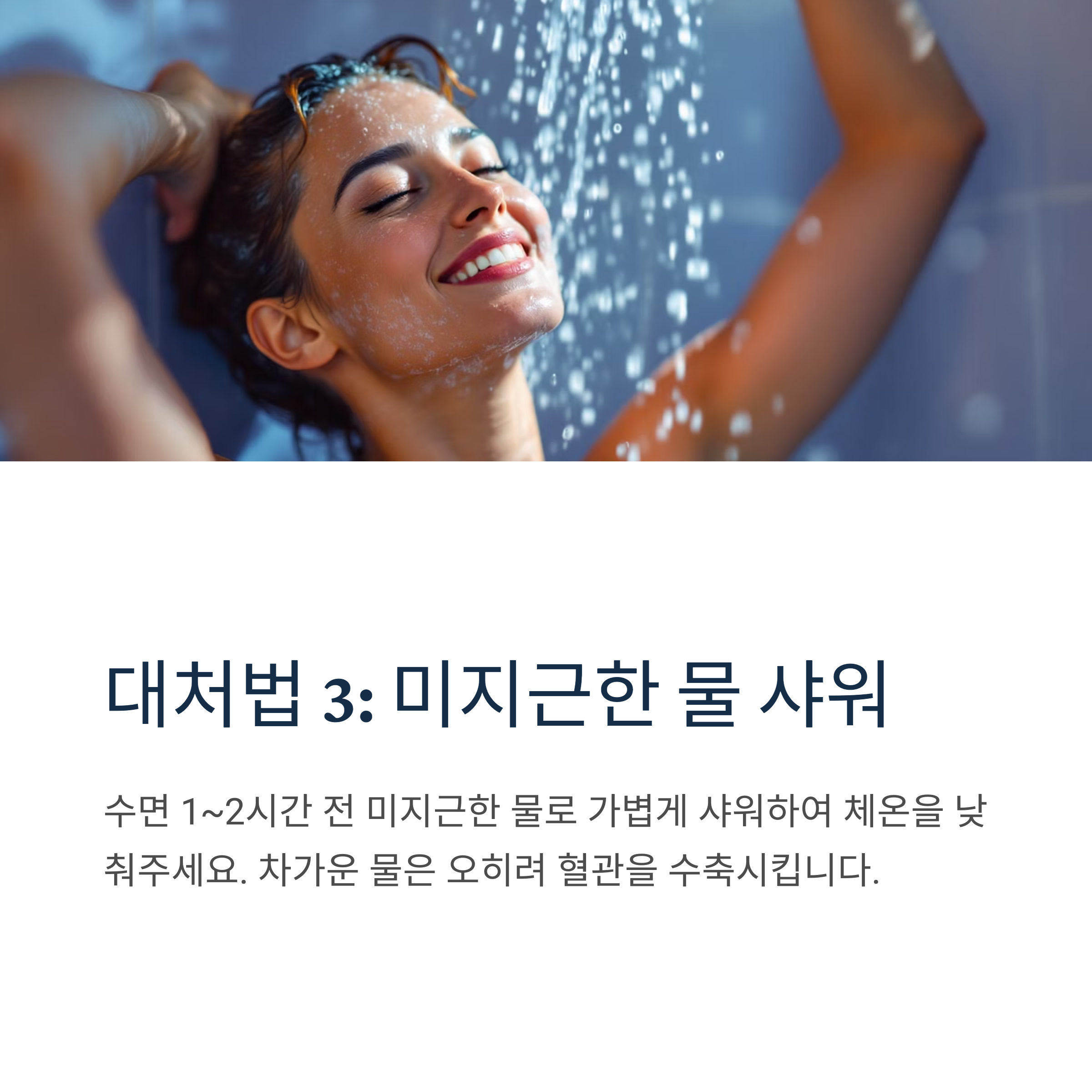 수면 1~2시간 전 미지근한 물로 가볍게 샤워하여 체온을 낮춰주세요. 차가운 물은 오히려 혈관을 수축시켜 체온 조절을 방해할 수 있습니다.