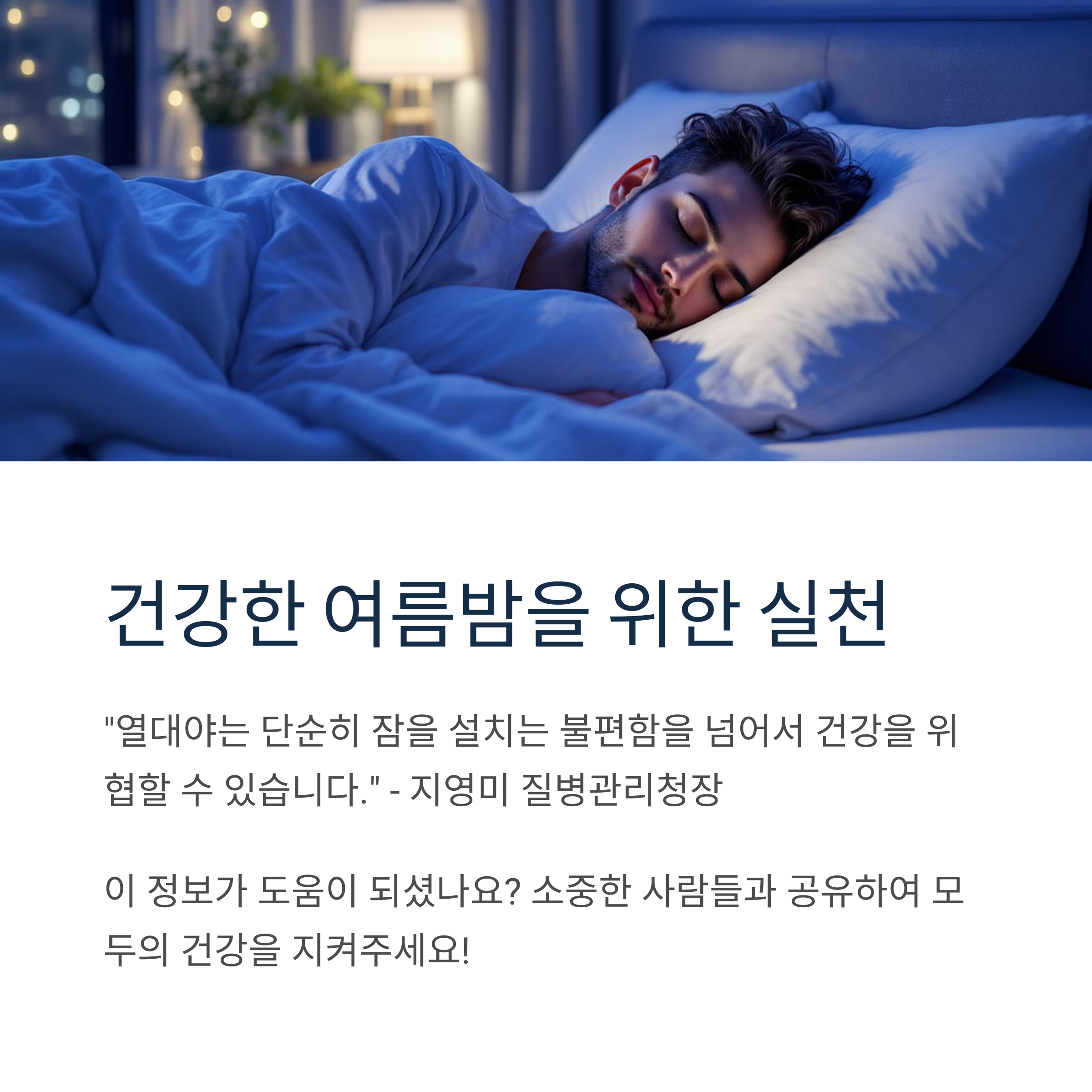 올해 예년보다 빠른 무더위와 열대야로 인해 건강관리가 더욱 중요해졌습니다. 질병관리청 지영미 청장은 "열대야는 단순히 잠을 설치는 불편함을 넘어서 건강을 위협할 수 있으므로 건강 수칙을 실천해야 한다"며 각별한 주의를 당부했습니다.