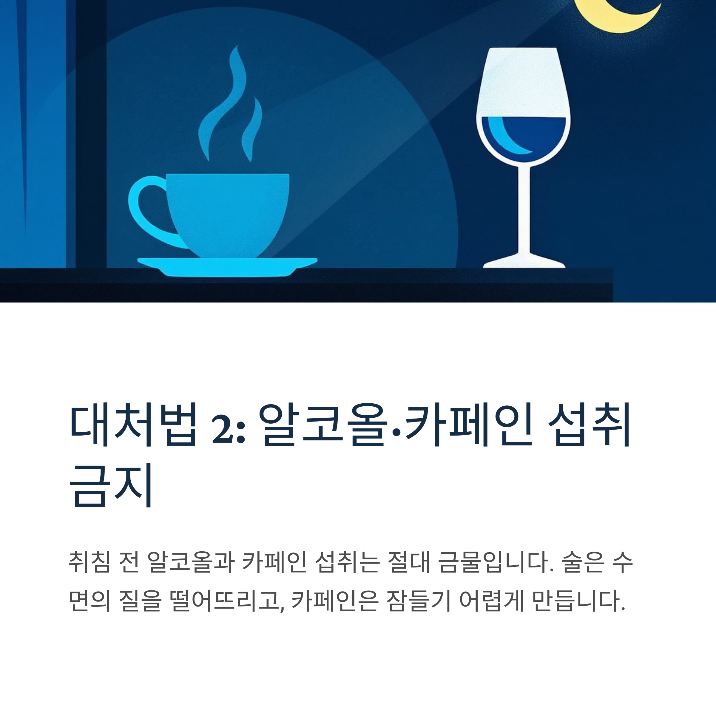취침 전 알코올과 카페인 섭취는 절대 금물입니다. 술은 일시적으로 졸음을 유발하지만 실제로는 수면의 질을 떨어뜨리고, 카페인은 각성 효과로 인해 잠들기 어렵게 만듭니다.