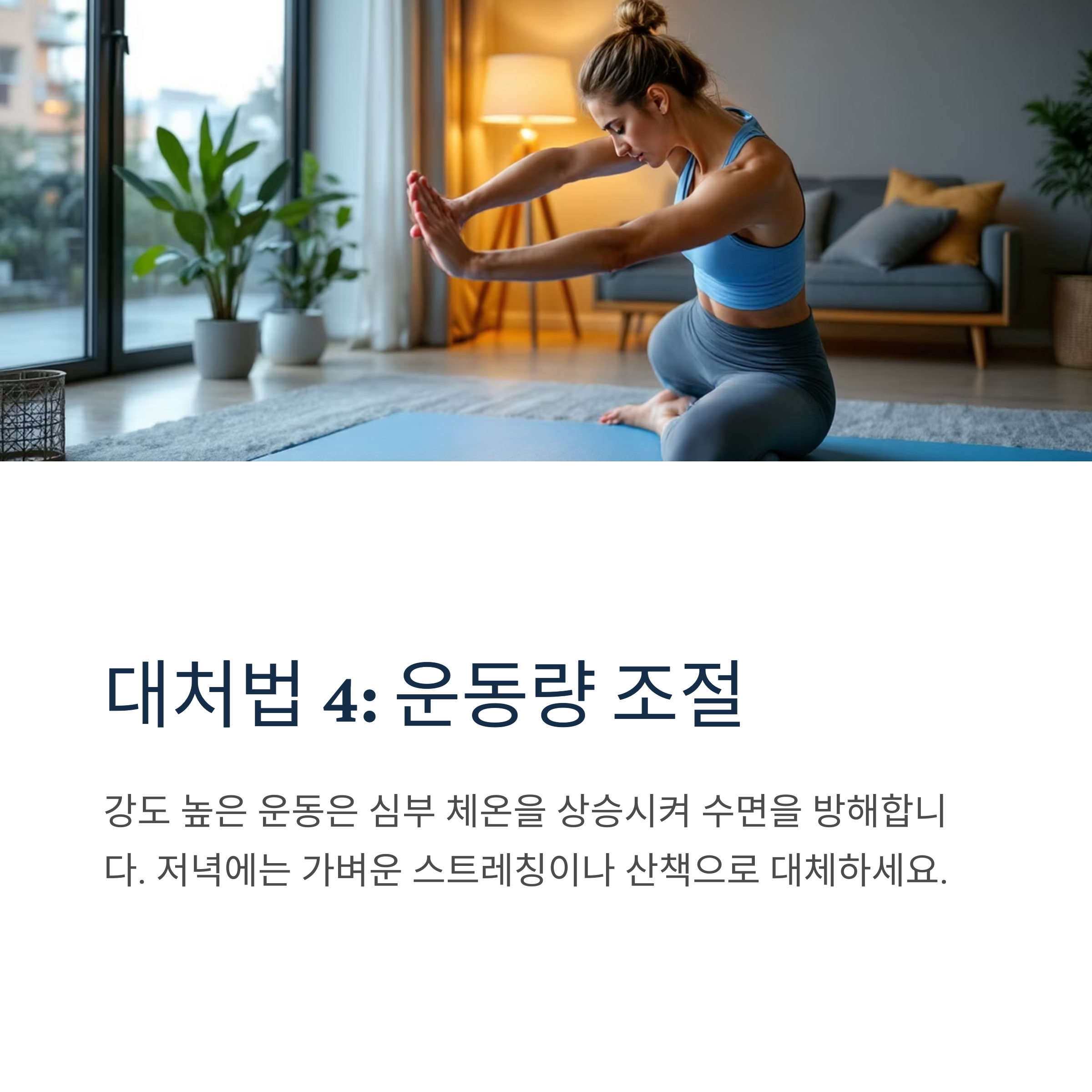 강도 높은 운동은 심부 체온을 상승시켜 수면을 방해하므로, 저녁 시간대에는 가벼운 스트레칭이나 산책 정도로 운동량을 조절하는 것이 좋습니다.