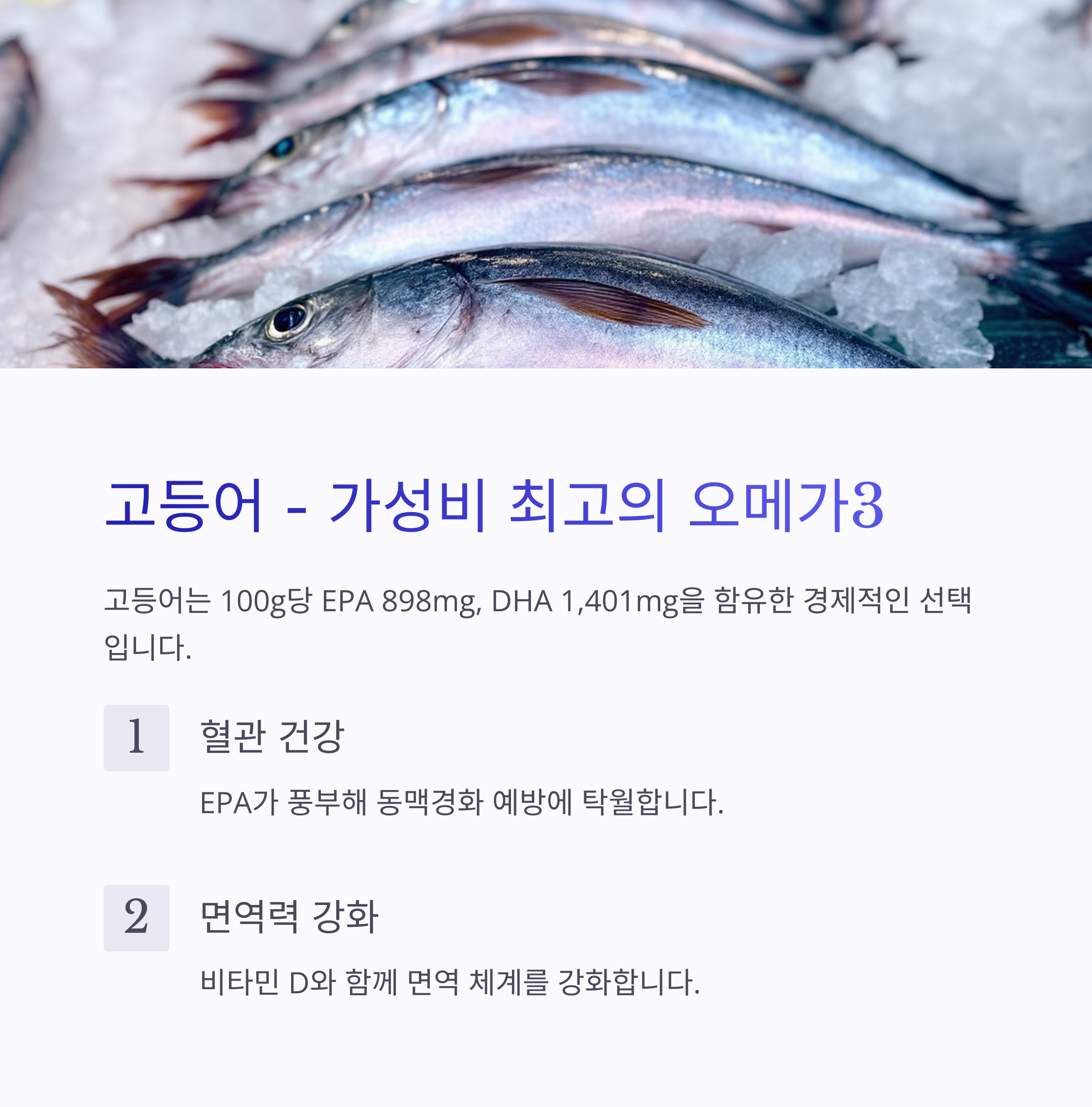 고등어는 연어 못지않은 오메가3 함량을 자랑하는 경제적인 선택입니다. 100g당 EPA 898mg, DHA 1,401mg을 함유하고 있어 가성비 최고의 오메가3 공급원입니다.