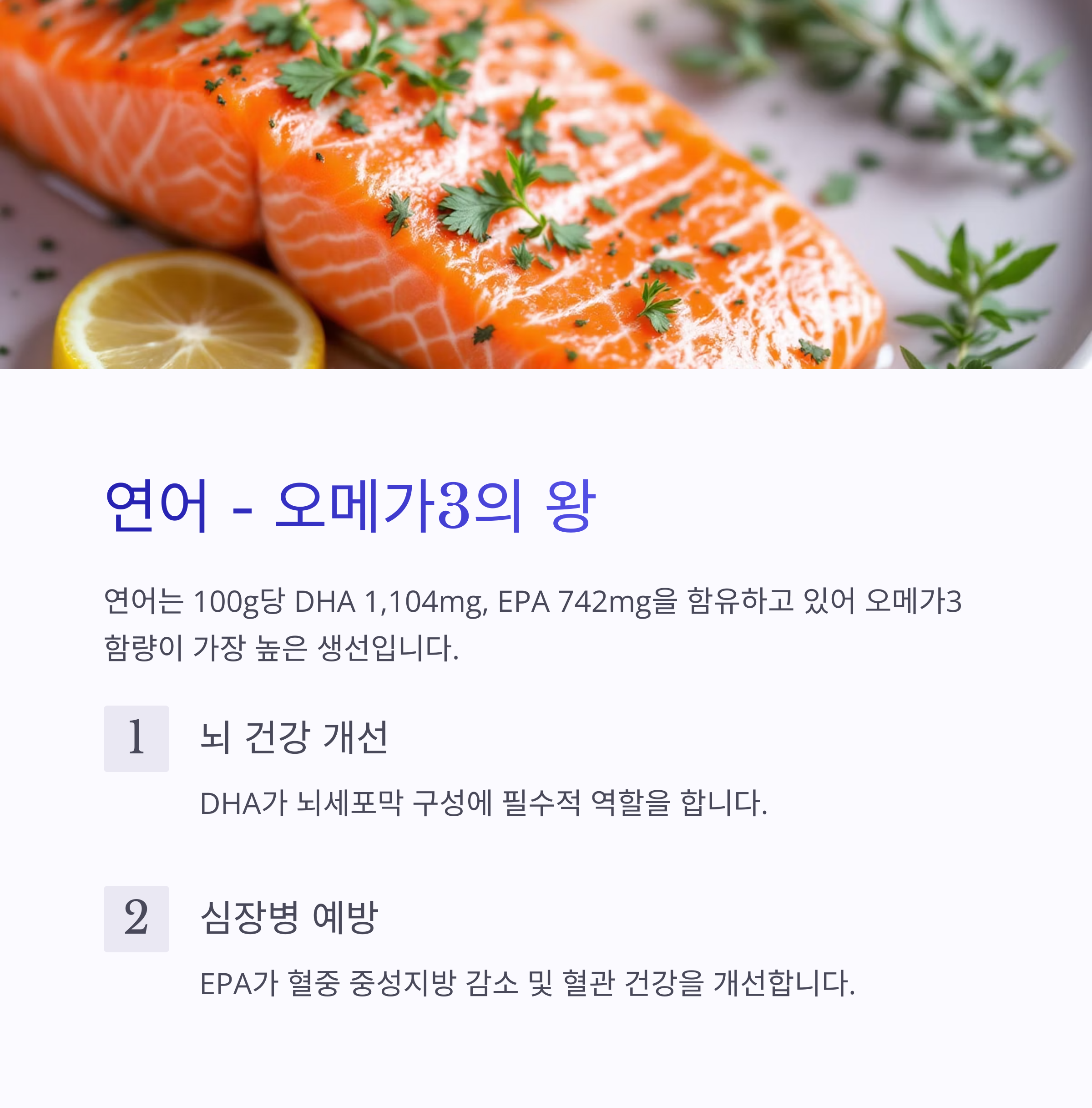 연어는 오메가3 함량이 가장 높은 대표적인 생선입니다. 100g당 DHA 1,104mg, EPA 742mg을 함유하고 있어 하루 권장량을 충분히 충족시킬 수 있습니다.