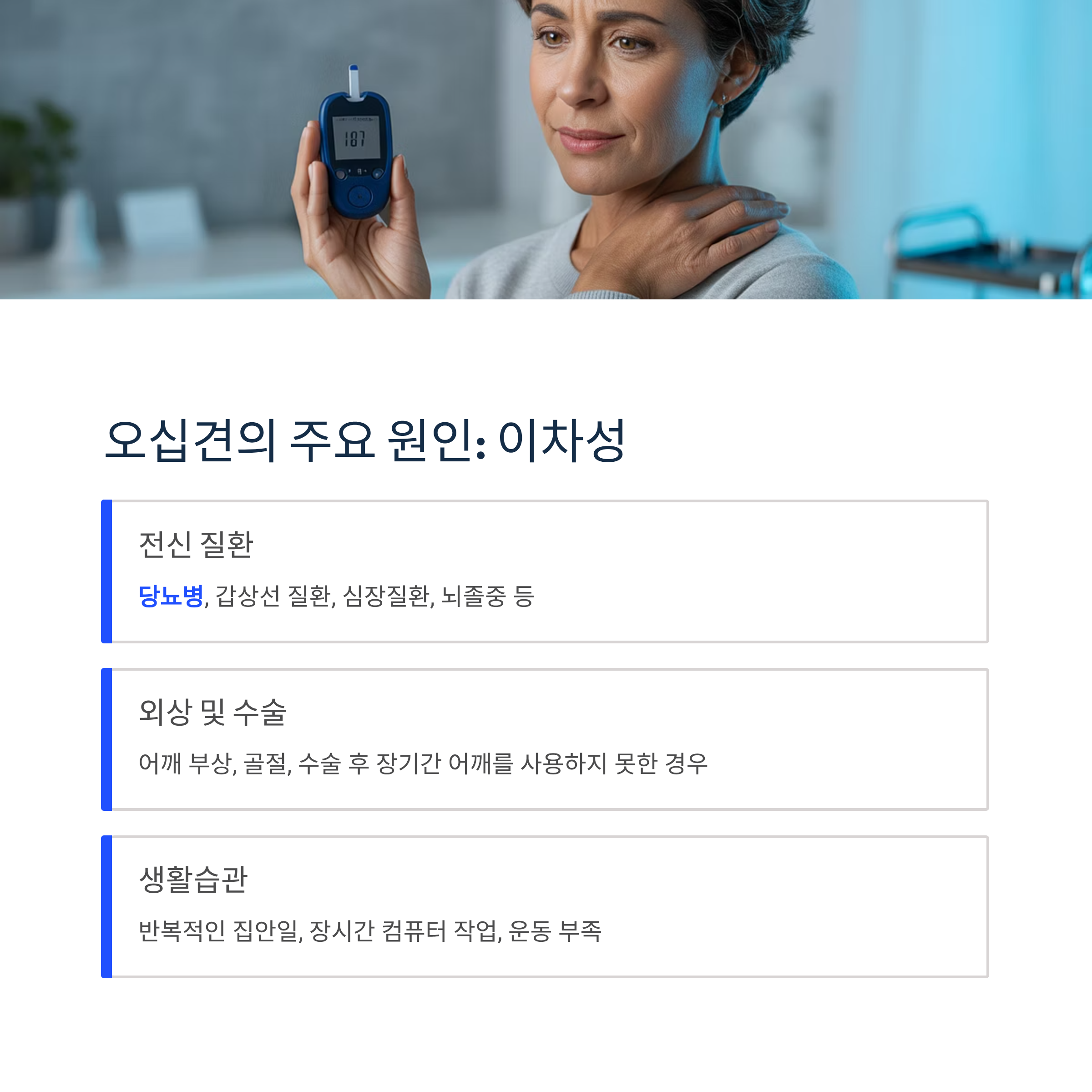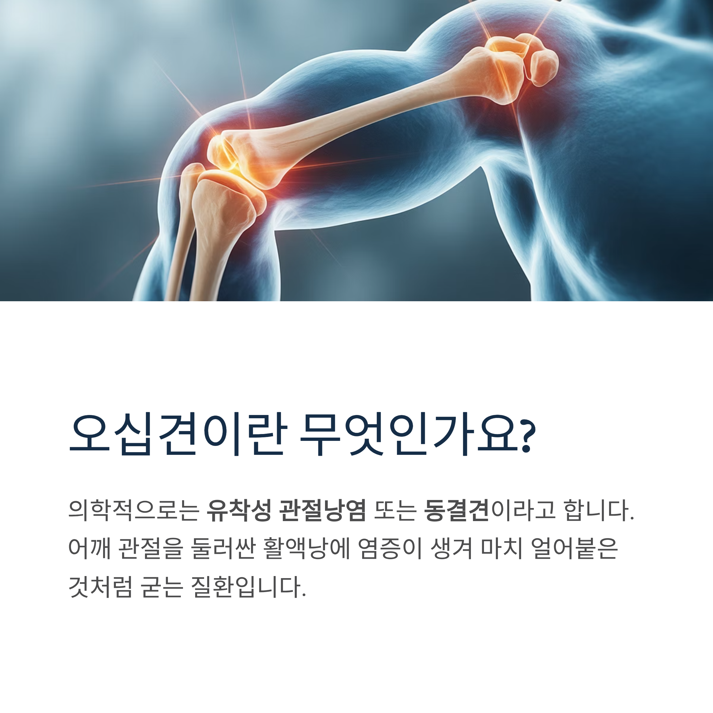 오십견의 정확한 의학적 명칭은 유착성 관절낭염(adhesive capsulitis) 또는 동결견(frozen shoulder)입니다. 어깨 관절을 둘러싸고 있는 주머니와 같은 활액낭에 염증이 생기며 굳는 질환으로, 어깨가 마치 얼어버린 것처럼 굳는다고 해서 동결견이라고도 불립니다.