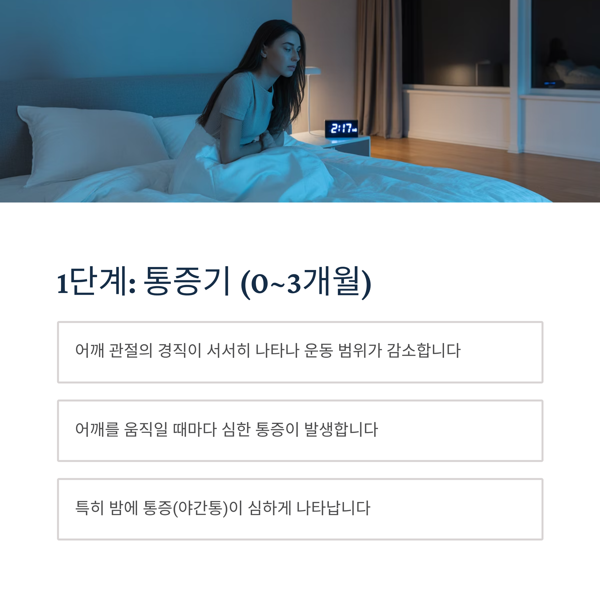 첫 번째 단계인 통증기는 발병으로부터 3~6개월까지로, 가동 범위가 점점 줄어들면서 통증이 점차 심해지는 단계입니다.