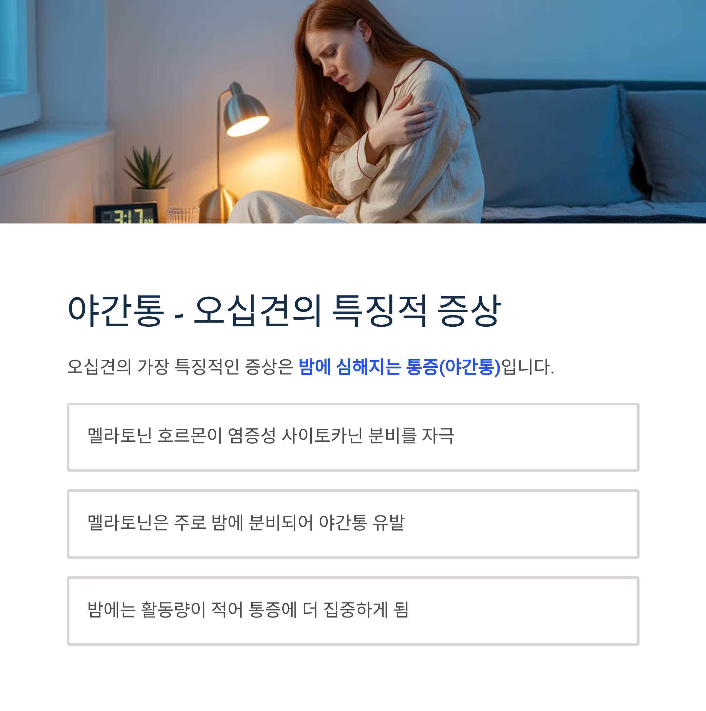 오십견의 가장 특징적인 증상은 야간통입니다.