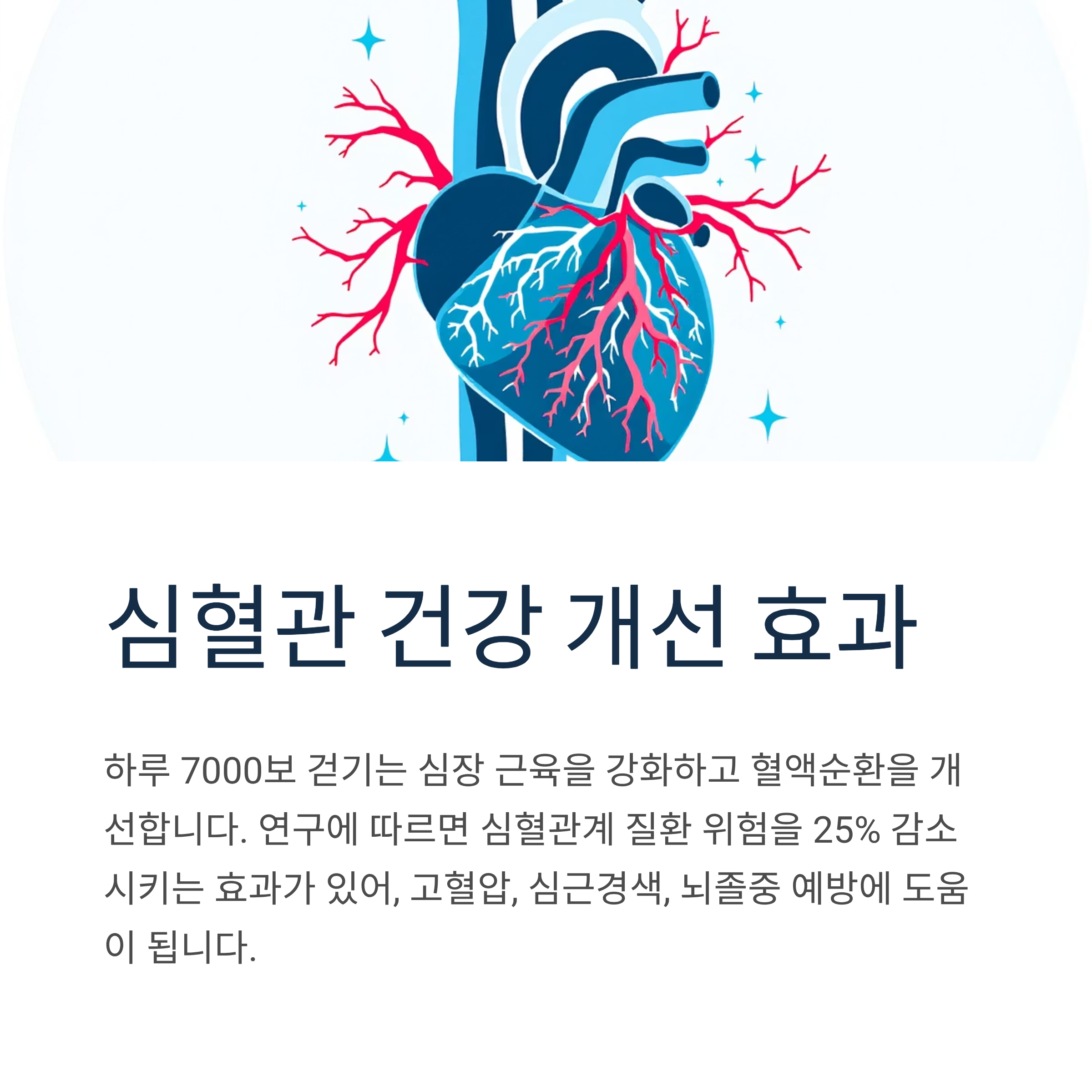 하루 7000보 걷기는 심장 근육을 강화하고 혈액순환을 개선합니다. 연구에 따르면 심혈관계 질환 위험을 25% 감소시키는 효과가 있어, 고혈압, 심근경색, 뇌졸중 예방에 도움이 됩니다.