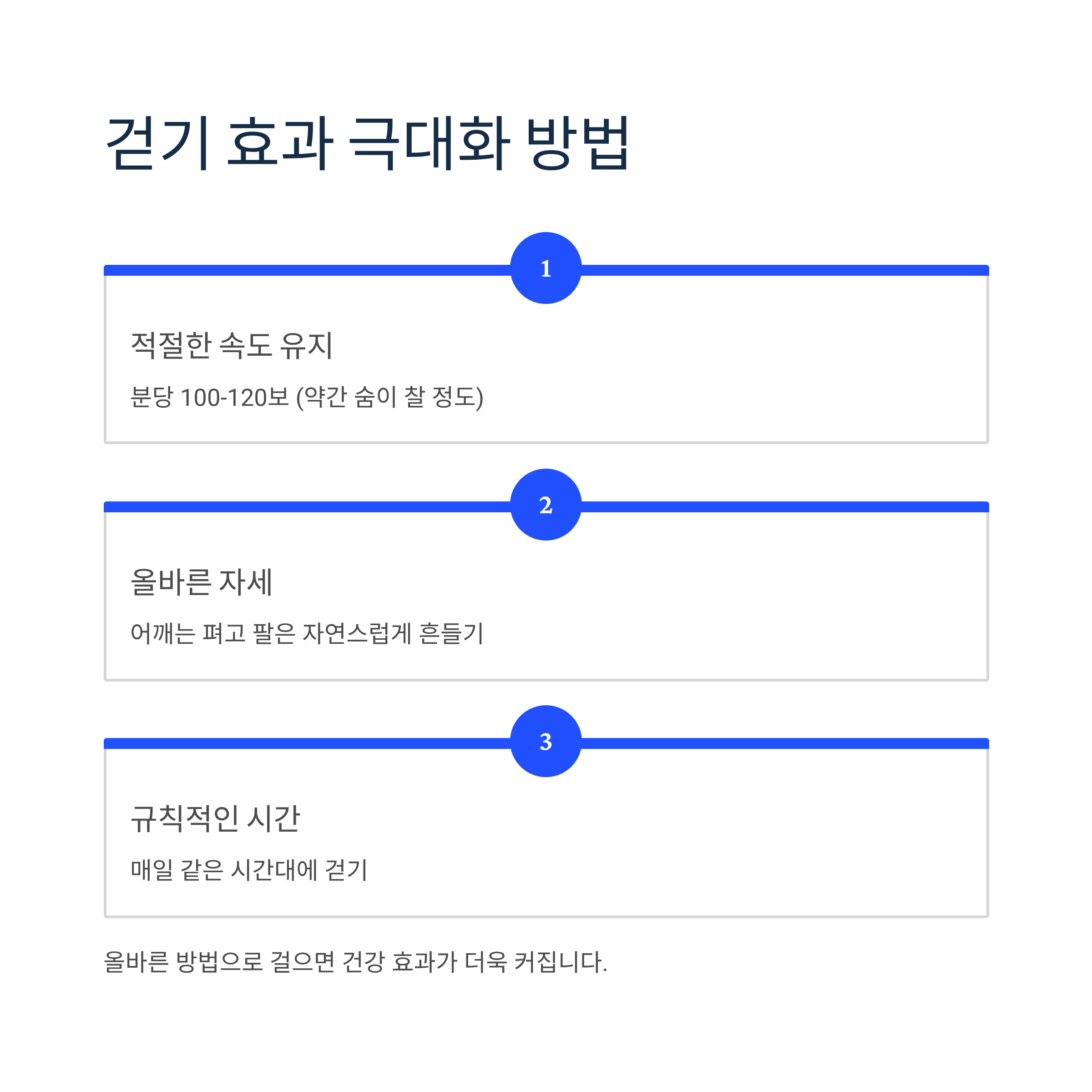 - 적절한 속도 유지: 분당 100-120보 (약간 숨이 찰 정도)