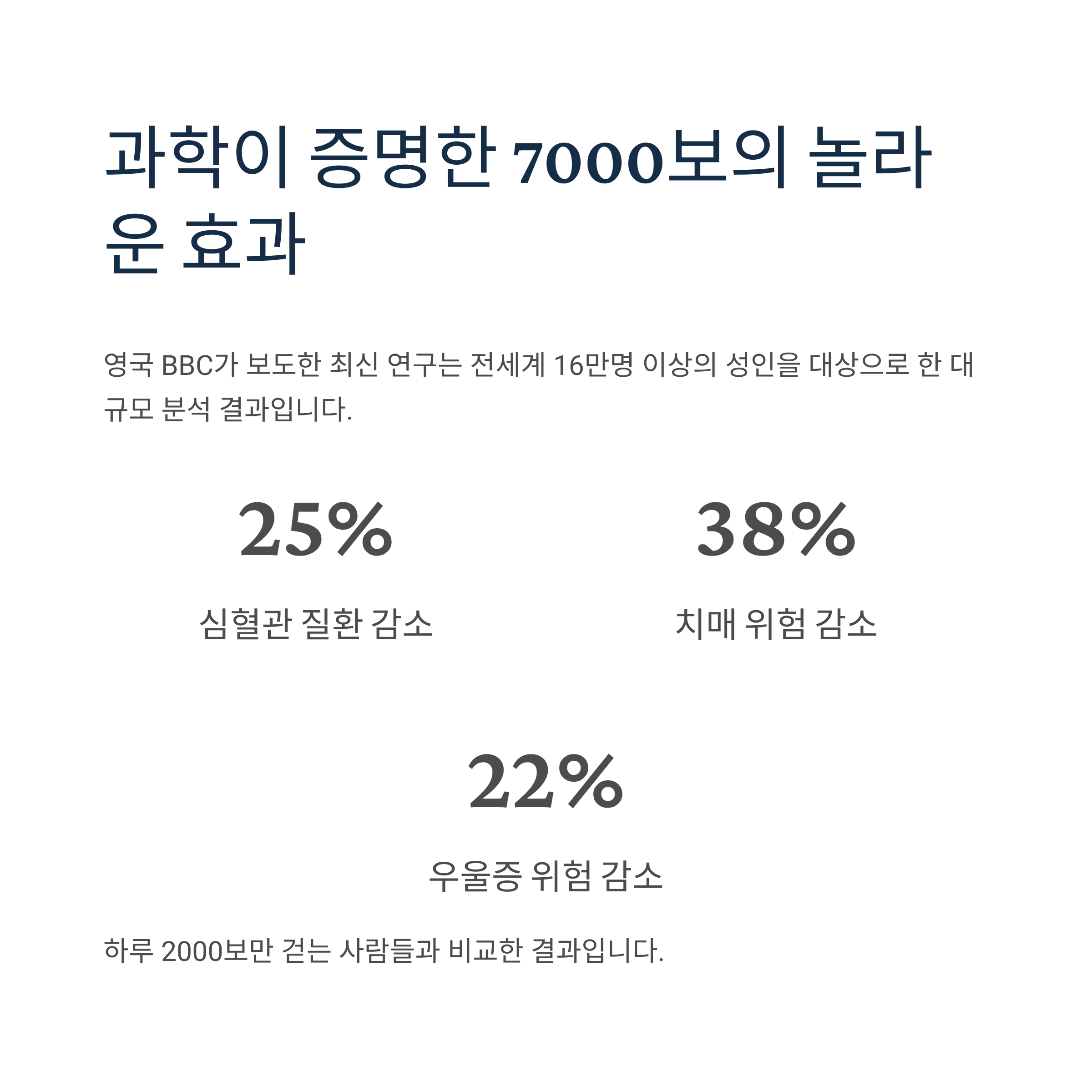 이는 하루 2000보만 걷는 사람들과 비교했을 때의 결과로, 7000보 걷기만으로도 상당한 건강 개선 효과를 얻을 수 있음을 의미합니다.