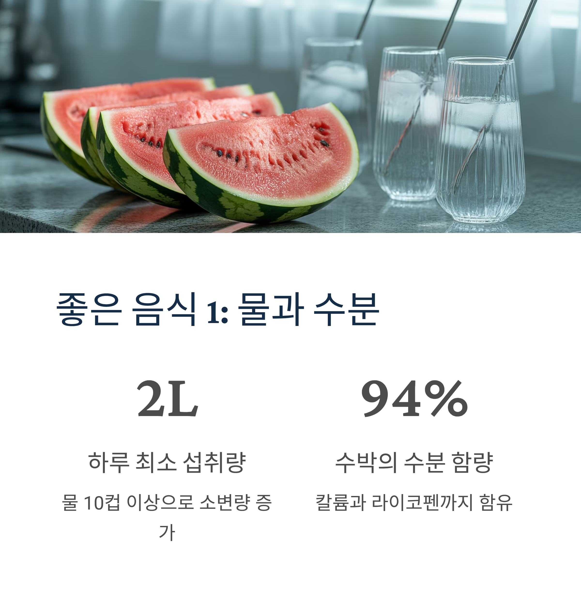 추천 음식: 수박은 94%의 수분을 가지고 있으며, 칼륨도 함유하고 있어서 이뇨작용에 도움이 됩니다. 또 수박에 들어 있는 라이코펜이라는 성분은 항암 효과와 항산화 기능, 유해산소 제거에 도움이 됩니다.