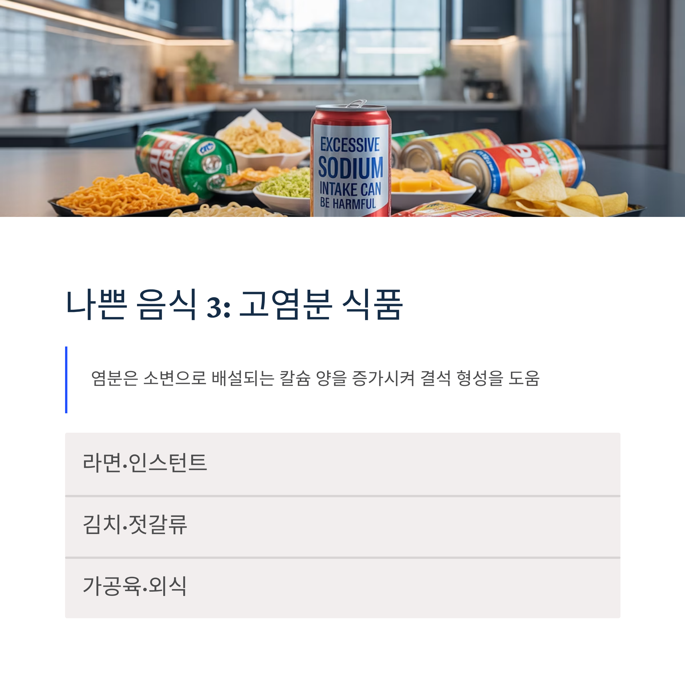 염분(나트륨)은 소변으로 배설되는 칼슘 양을 증가시켜 결석의 형성을 도울 수 있으므로 가급적 싱겁게 먹어야 합니다.