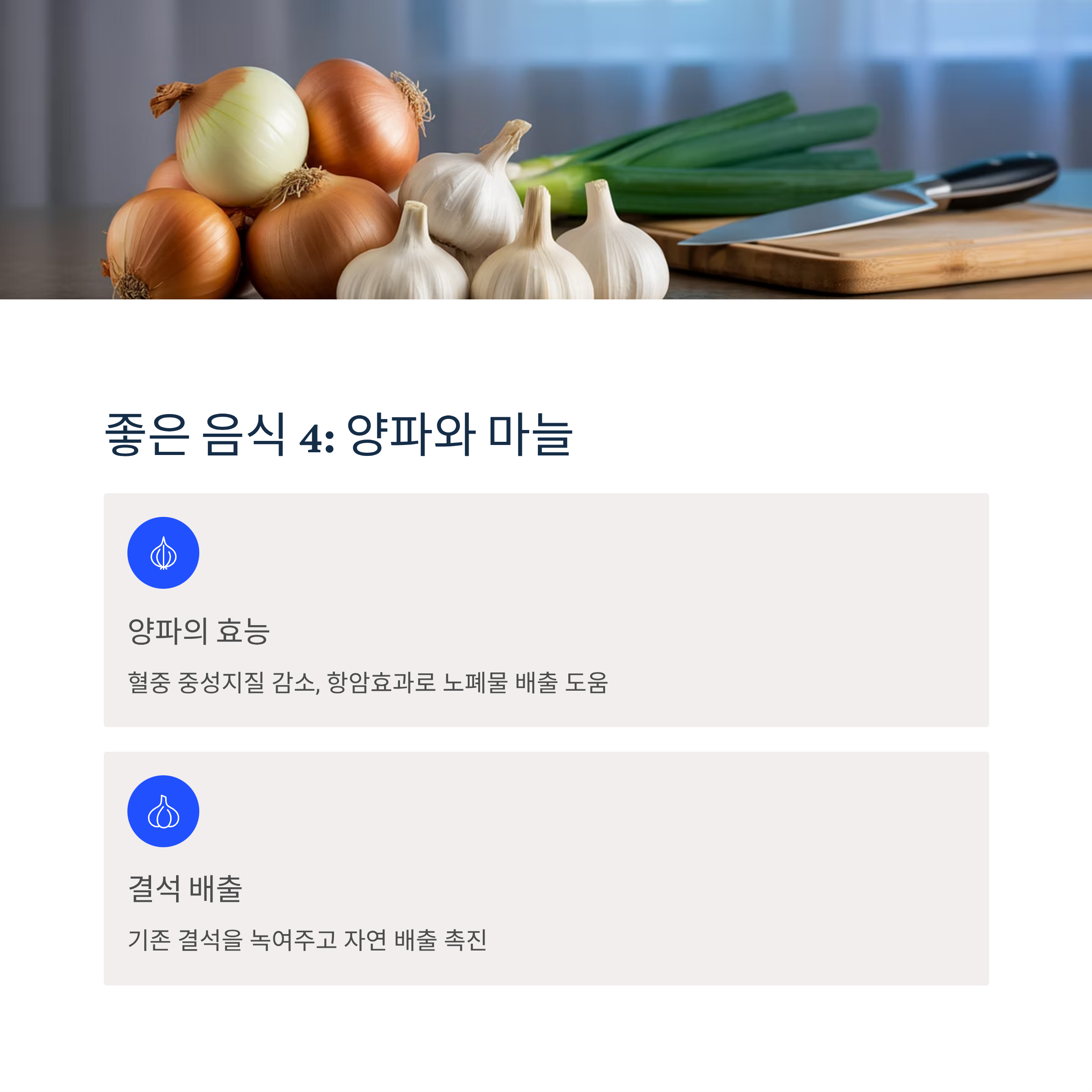 결석이 이미 생겼다면 양파가 도움 됩니다. 양파는 혈중 중성지질과 항암효과가 있어 노폐물 배출에 도움이 되어 결석을 녹여주고, 결석의 자연 배출을 돕습니다.