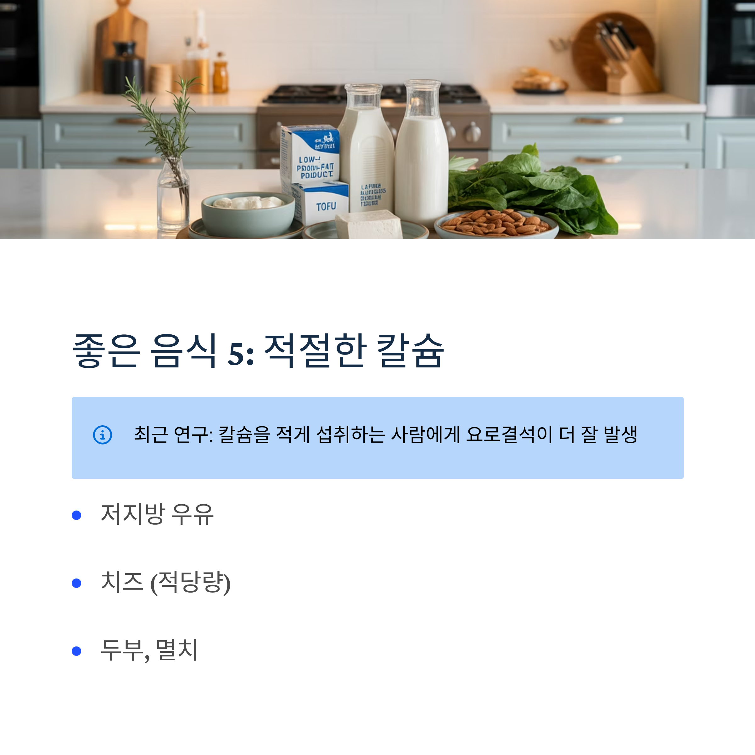 최근 연구결과는 칼슘을 적게 복용하는 사람에게 요로결석이 더 잘 생긴다고 알려져 있습니다. 또한 요로결석환자에게 칼슘 섭취를 너무 제한하면 골다공증 위험성이 있습니다.