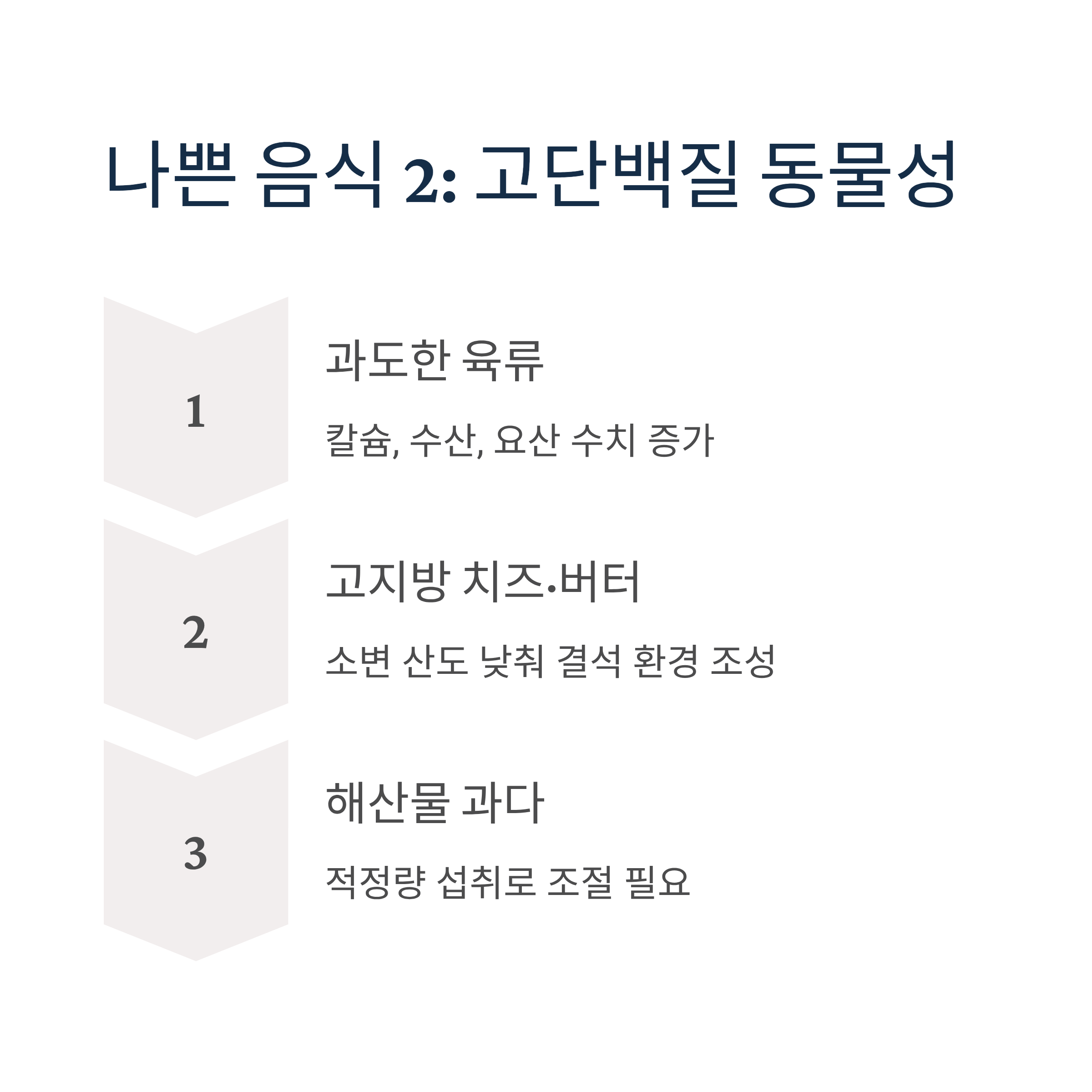 동물성 단백질(육류, 생선, 계란, 해산물 등)의 과량 섭취는 결석의 성분이 되는 칼슘, 수산, 요산의 소변 내 수치를 높이고 소변 산도를 낮추어 결석이 잘 형성되는 환경을 만듭니다.