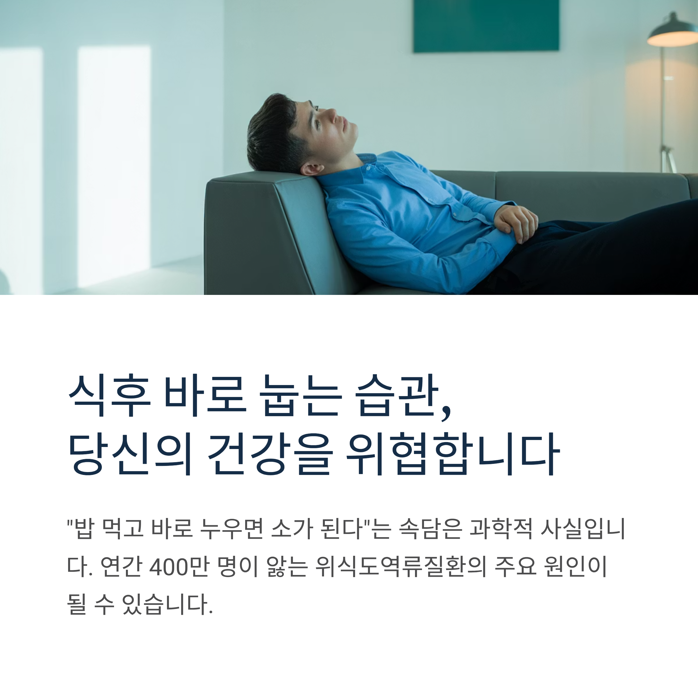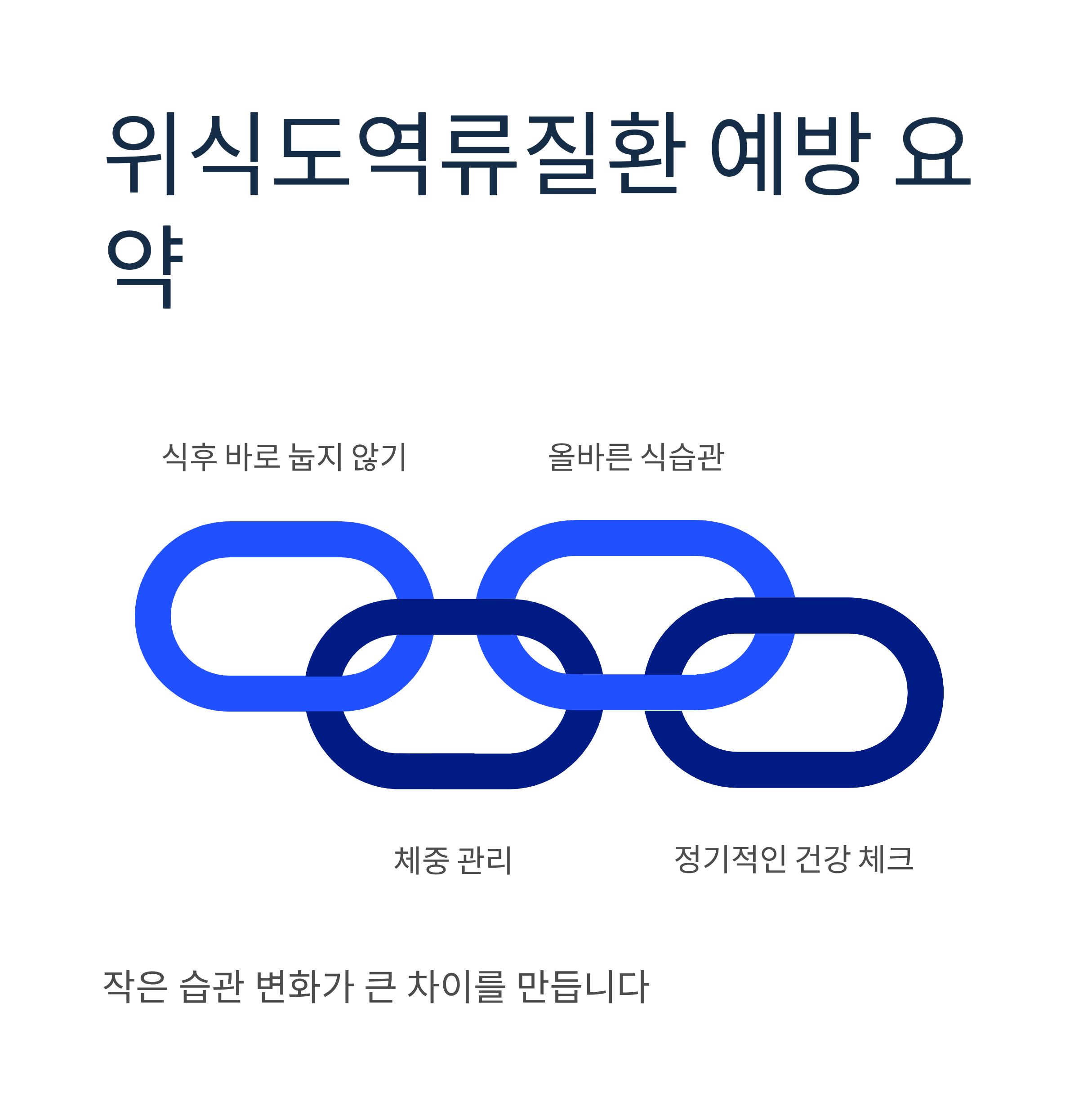 위식도역류질환은 단순한 소화불량이 아닌 적극적인 관리가 필요한 만성질환입니다. 식후 바로 눕는 습관을 개선하고, 체중 관리와 올바른 식습관을 유지한다면 충분히 예방하고 관리할 수 있습니다.
