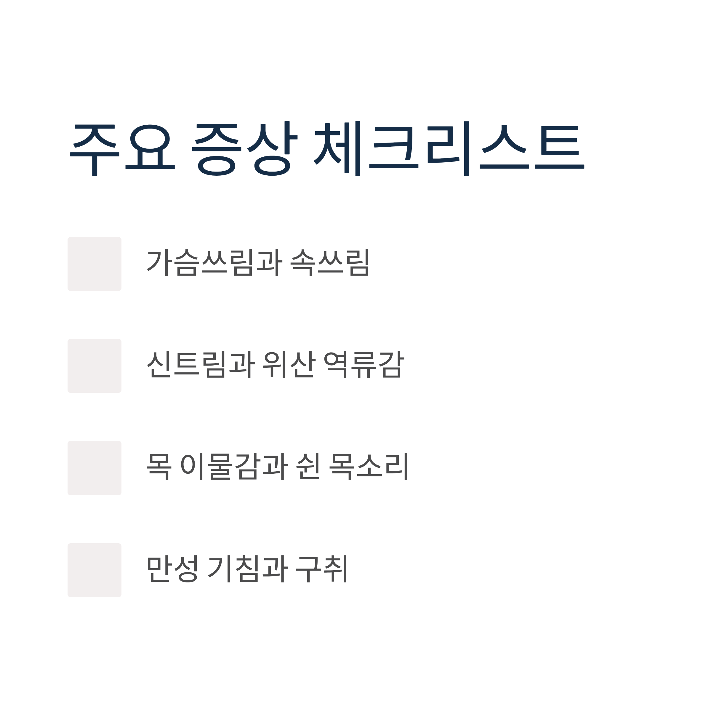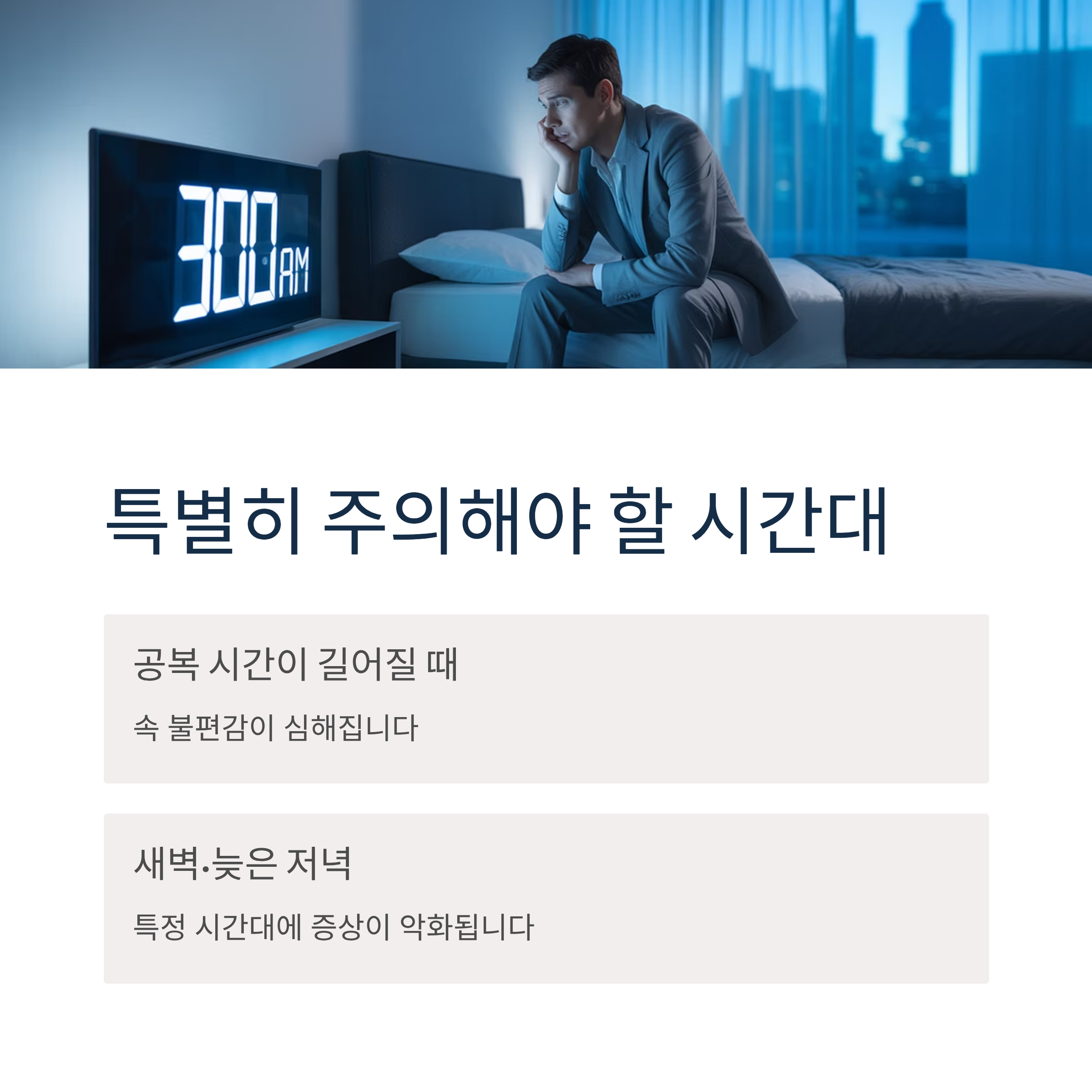 특히 공복 시간이 길어질 때 속 불편감이나 새벽·늦은 저녁 특정 시간대 증상이 나타난다면 위식도역류질환을 강하게 의심해볼 필요가 있습니다.