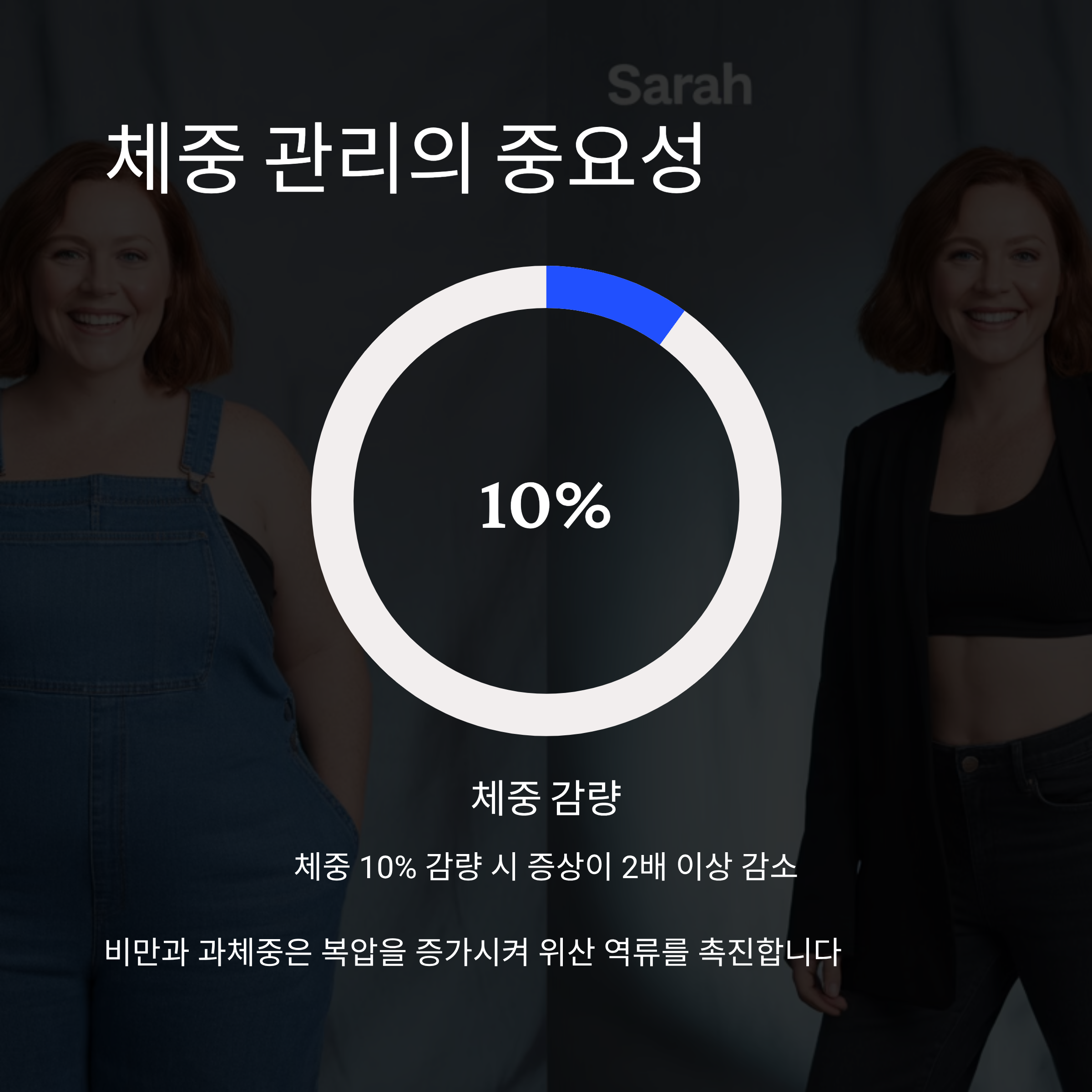 체중 10% 감량 시 증상이 2배 이상 감소한다는 연구결과가 있습니다. 비만과 과체중은 복압을 증가시켜 위산 역류를 촉진하므로 체중 관리가 필수입니다.