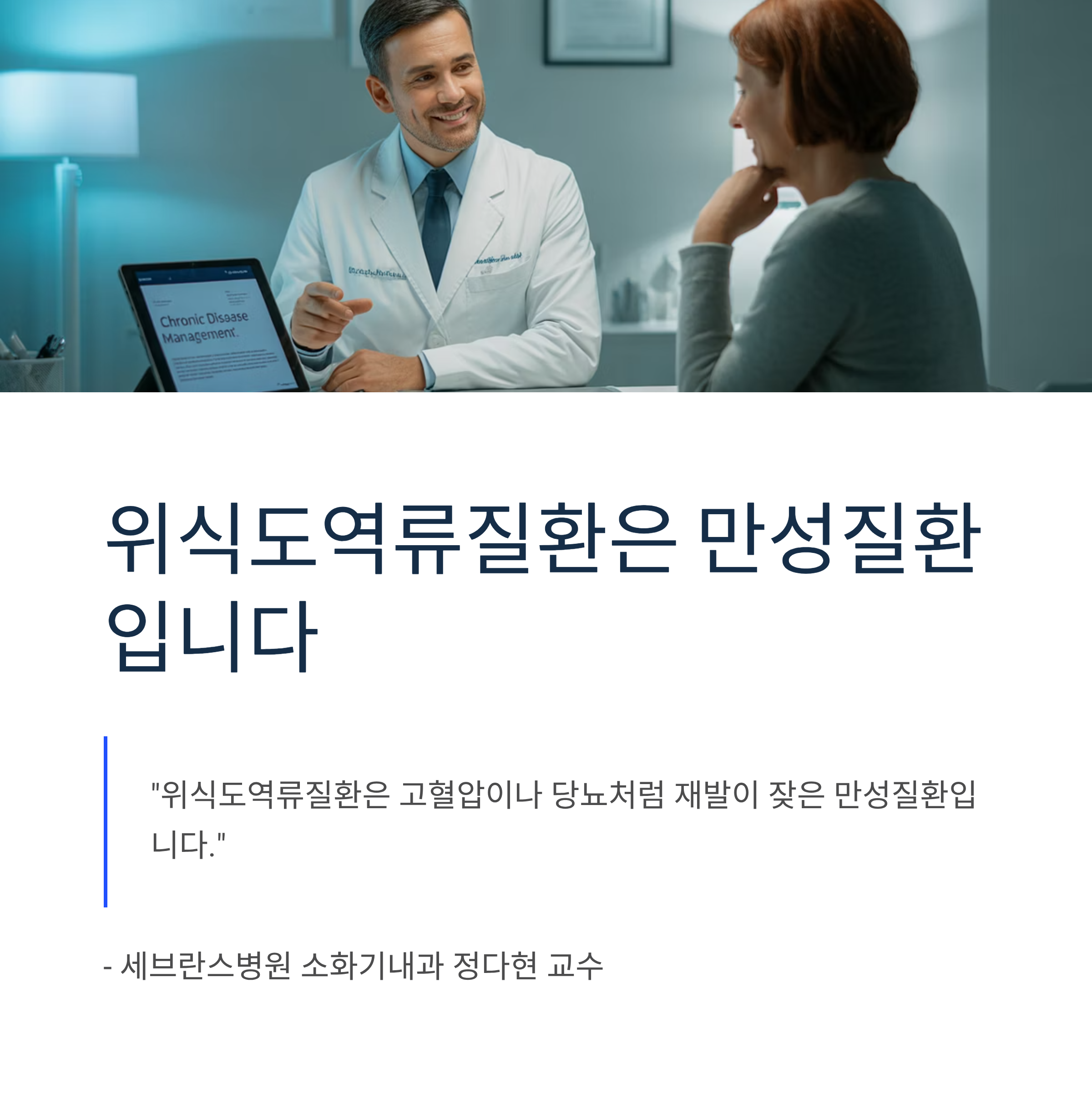 정다현 교수는 "위식도역류질환은 고혈압이나 당뇨처럼 재발이 잦은 만성질환"이라며 "약물치료 후에도 유지요법을 병행하지 않으면 1년 내 50-80%가 재발한다"고 강조했습니다.