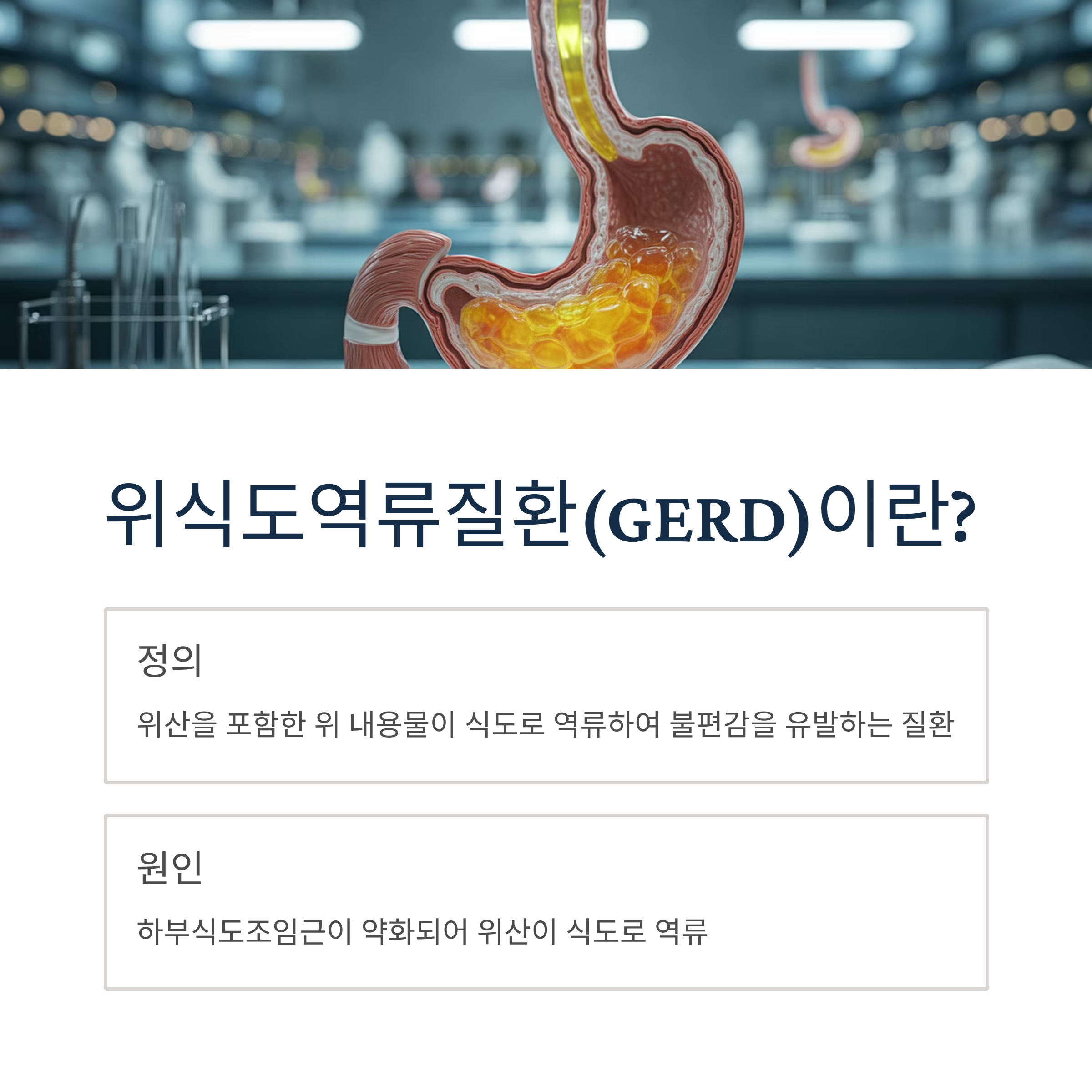 위식도역류질환(GERD)은 위산을 포함한 위 내용물이 식도로 역류하여 불편감을 유발하는 질환입니다. 정상적으로는 하부식도조임근이 위산의 역류를 막아주지만, 이 기능이 약화되면서 발생합니다.