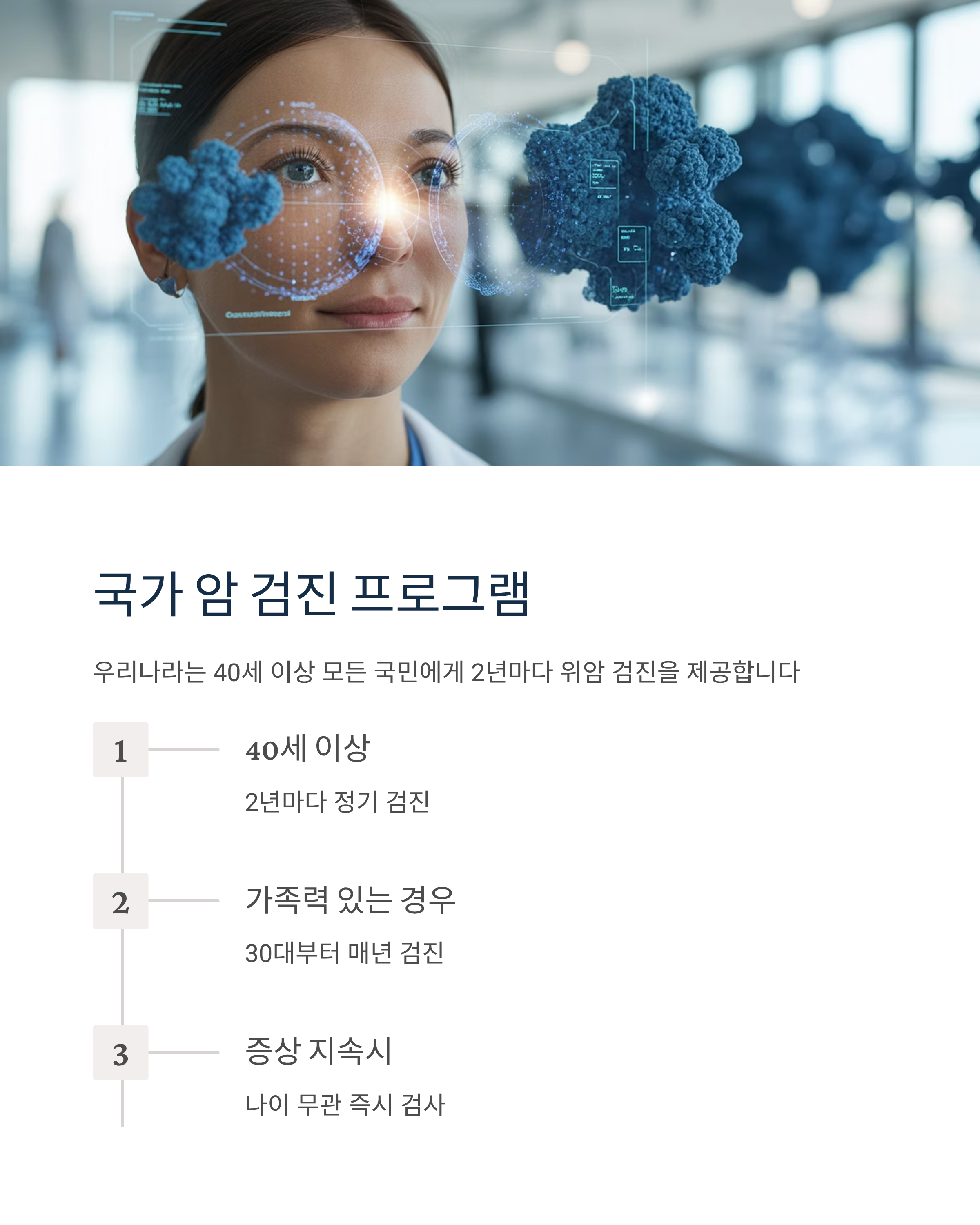 우리나라는 국가 암 검진 사업을 통해 40세 이상 모든 국민에게 2년에 한 번씩 위암 조기 검진을 시행하고 있습니다. 하지만 위암 가족력이 있거나 증상이 있으면 40세 이전이라도 내시경검사를 받는 게 바람직합니다.