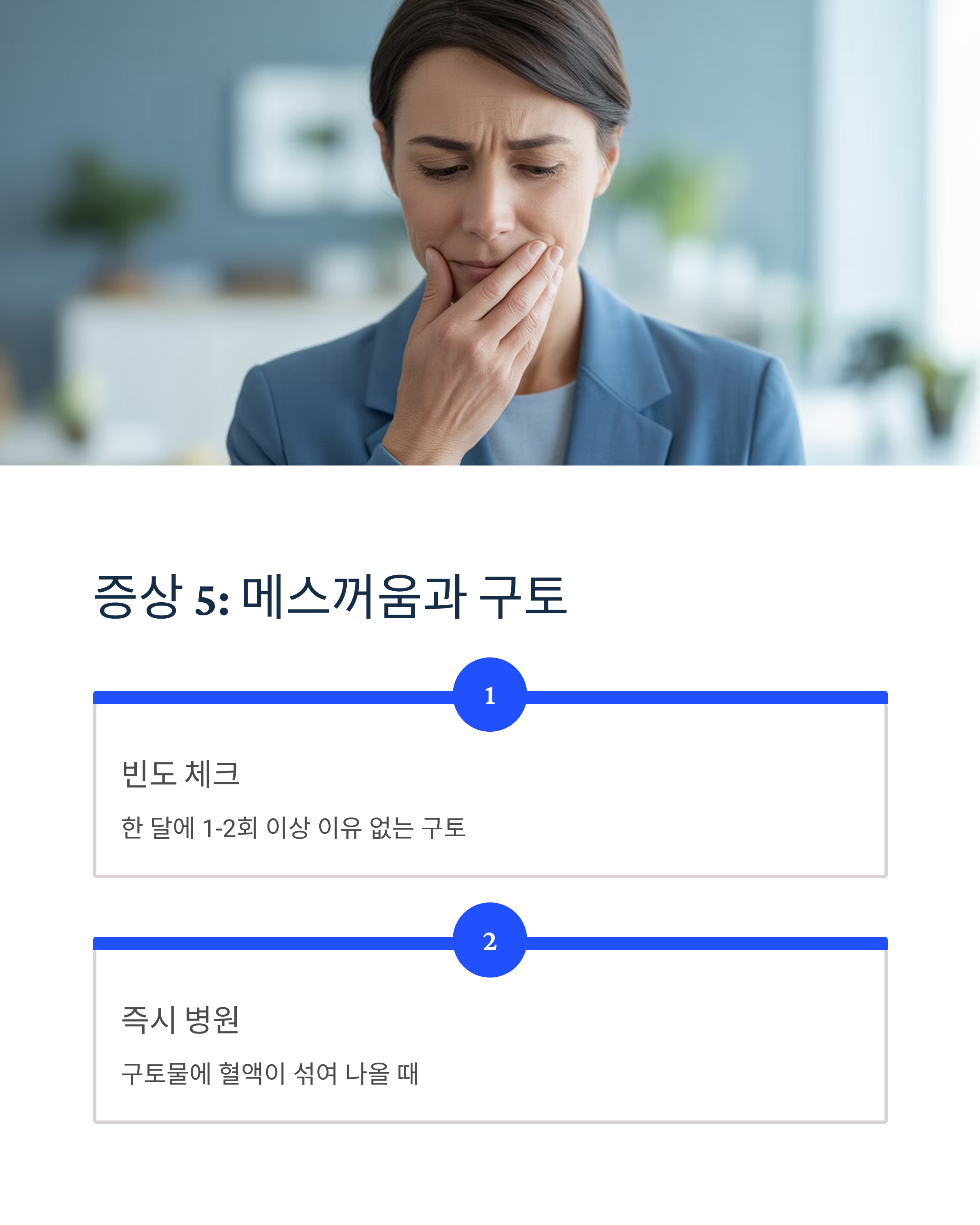 암이 진행되면서 유문부 폐색에 의한 구토가 발생할 수 있습니다. 특히 한 달에 1-2회 이상 이유 없이 구토하거나, 구토물에 혈액이 섞여 나온다면 즉시 병원을 방문해야 합니다.