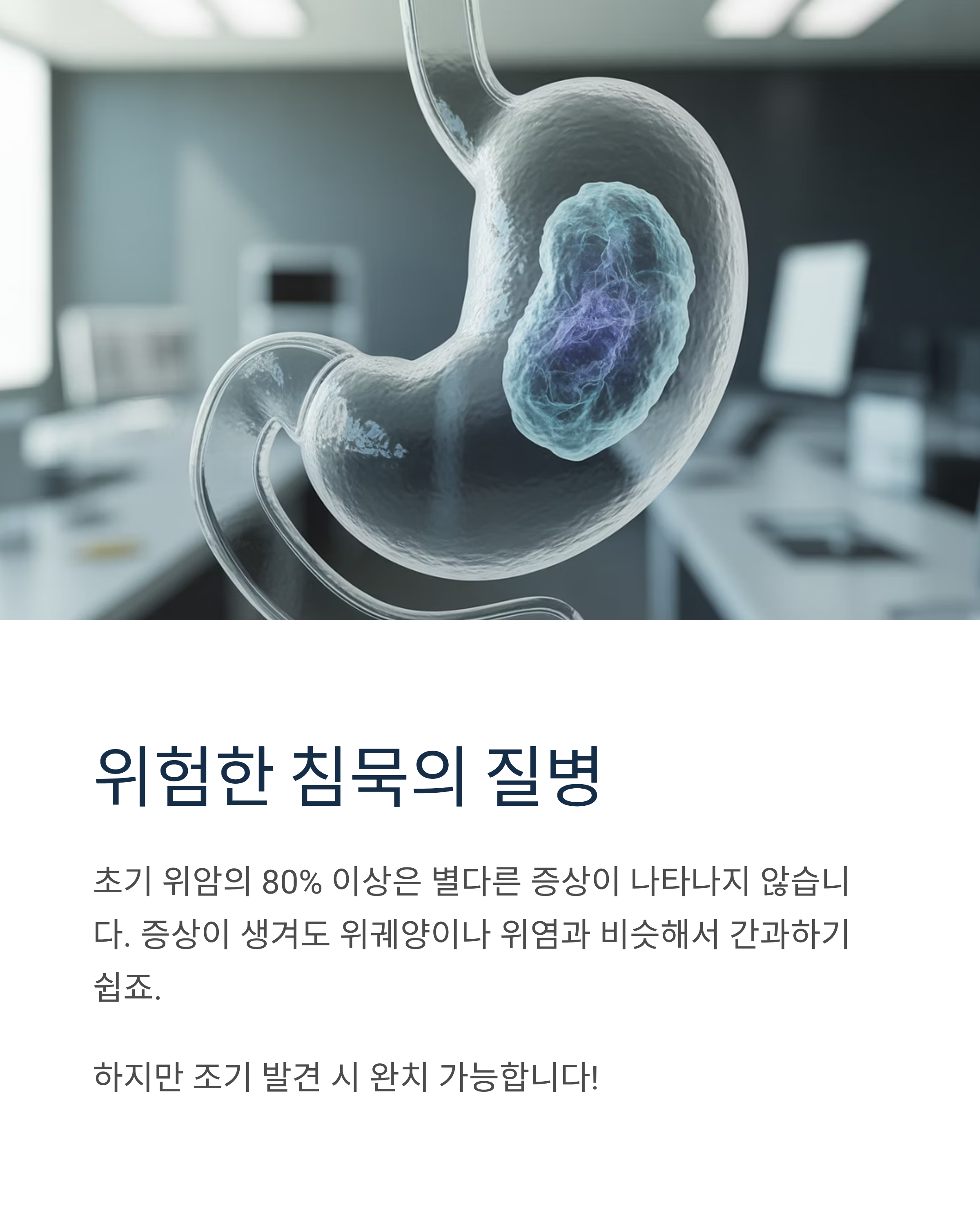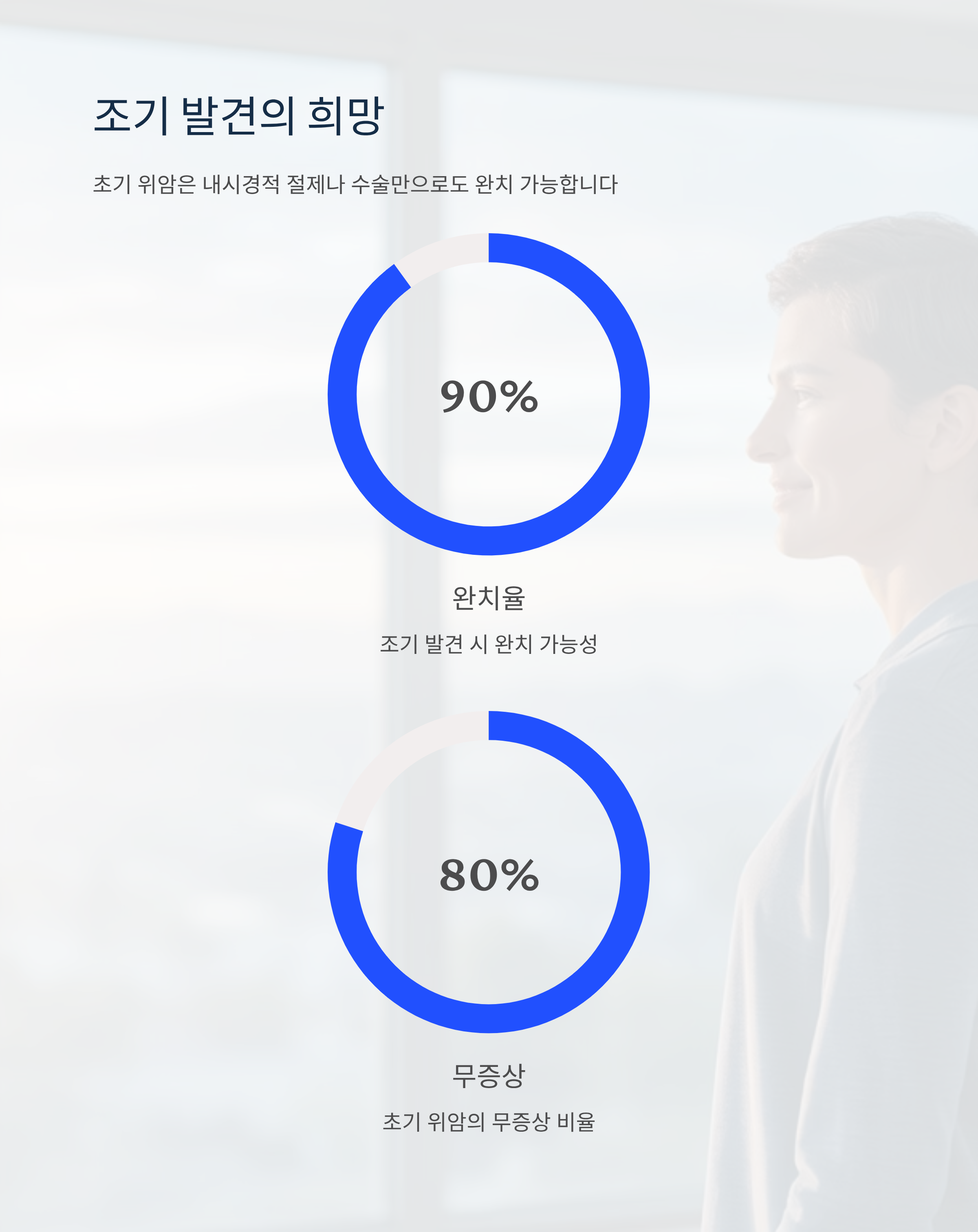 초기 위암의 80% 이상은 별다른 증상이 나타나지 않으며, 증상이 생겨도 위궤양이나 위염 등의 증상이어서 간과하기 쉽습니다. 하지만 조기 발견 시 내시경적 절제나 수술 치료만으로도 완치가 가능하기 때문에, 작은 신호도 놓치지 않는 것이 중요합니다.