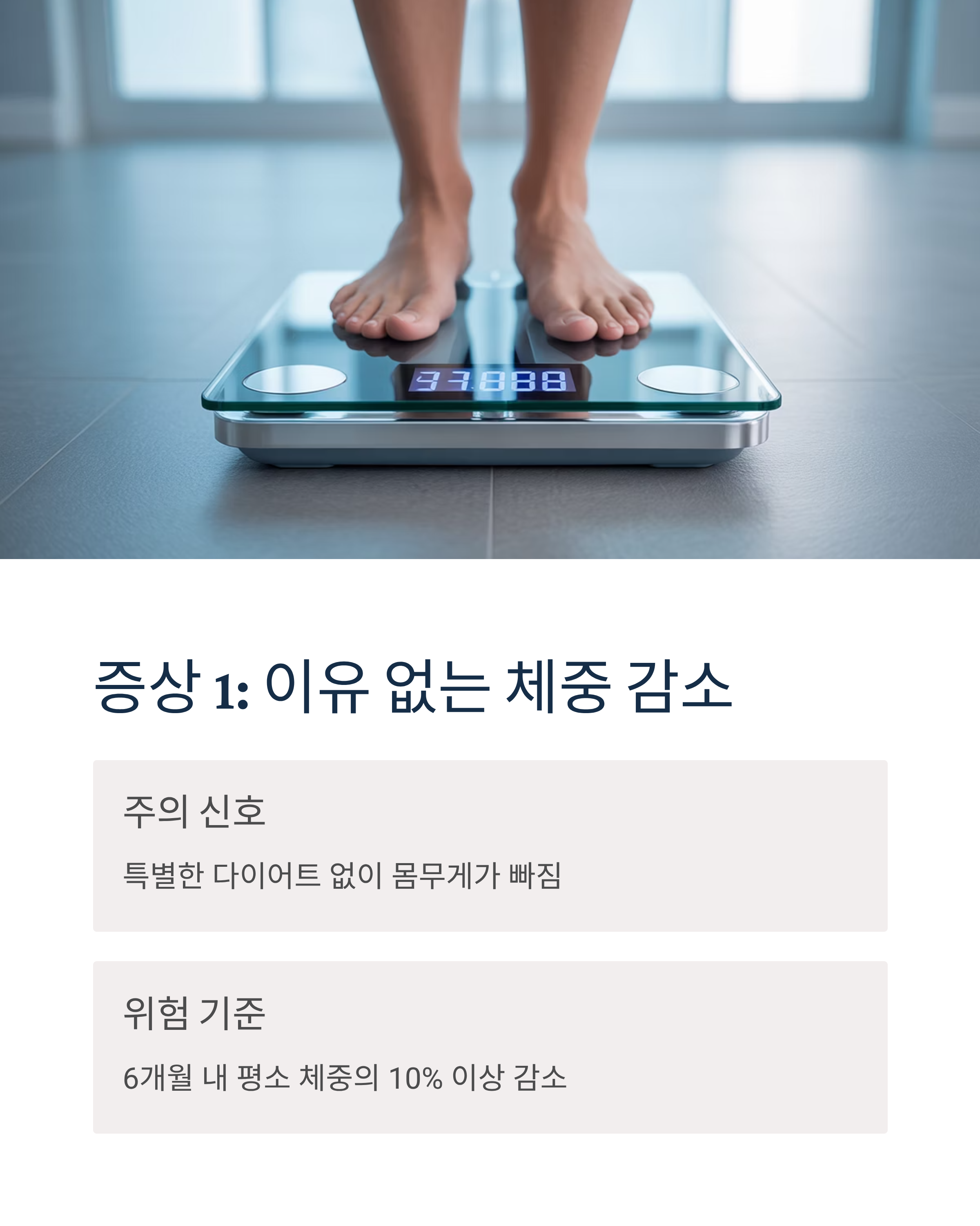 특별한 다이어트 노력 없이 몸무게가 빠지면 위암의 징후일 수 있습니다. 특히 6개월 이내에 평소 체중의 10% 이상 감소했다면 반드시 검진이 필요합니다.
