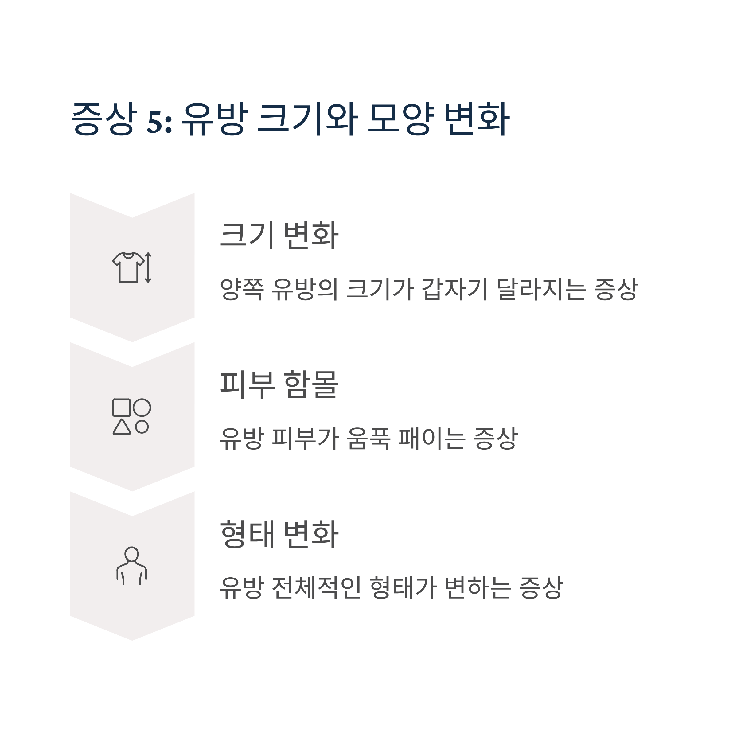 양쪽 유방의 크기가 갑자기 달라지거나, 유방 피부가 움푹 패이는 증상이 나타난다면 진찰을 받아야 합니다. 유방 전체적인 형태 변화도 주의 깊게 살펴봐야 합니다.